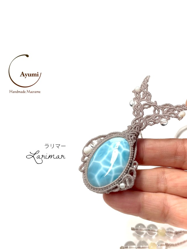 ドミニカ共和国から 直接仕入れた、 つやつやのラリマー‼︎ 温かい色の糸で ホワイトコーラルや クリアクォーツの ビーズと一緒に ふわふわ可愛いイメージで デザインしました♪ 深く美しい青を 遠くの明るい波間から チラリとのぞき見ているような ふんわりした石の模様に ぴったりだと思いませんか? 〈お守りジュエリー〉 ラリマーは言わずとしれた 三大ヒーリングストーンのひとつ。 世界中にファンが多い、人気の天然石です。 この石は我慢しすぎな自分も、そして他人も、 優しく受け入れられるようにしてくれます。 そのことで人間関係を円滑にし、 愛情と思いやりにみちた関係を深めるよう 助けてくれます。 天然石にお詳しい方も、とくにこだわりのない方も。 あなたの一番そばで、そっと味方になってくれます♪ 〈こだわり〉 Ayumiのアクセサリーは石ひとつひとつに合わせて デザインし、手仕事で作ってゆく一点もの。 世界にたった一つのアクセサリーが、 世界にたった一人のあなたと、 キセキの出会いを待っています♪ 〈ギフトにも最適〉 Ayumiのネックレスはトップ以外 ポリエステルの糸で出来ているので、 軽くて、金属アレルギーの心配がほぼありません。 またサイズ調整も出来て、 どんな女性へのギフトにもピッタリです♪♪♪ ※ 単品で1万円をこえるお買い物はギフトラッピングの上、送料無料にてお届けします。 〈サイズ詳細〉 ネックレス最長約78cm(アジャスターで調節可能) クリアクォーツ ホワイトコーラル グラスビーズ ラリマー 約3.3cm × 約2.2cm トップ全体 H6.2cm × W4.2cm 使用糸 ポリエステル100% ロウビキ Ayumi Handmade Macrame 検索ワード: マクラメ 大人 上品 プレゼント プチギフト 天然石 マクラメネックレス マクラメペンダント マクラメアクセサリー 天然石ネックレス 天然石ペンダント 天然石アクセサリー クリスマス お守り お守りジュエリー ラリマー