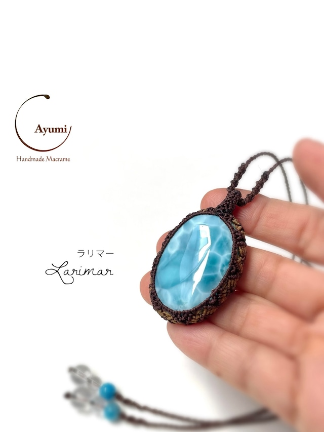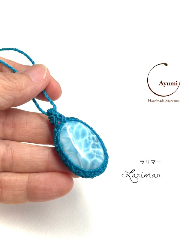 ドミニカ共和国から 直接仕入れた、 つやつやのラリマー‼︎ 小さめでも艶っぽく美しい! うるうるとかわいい このピースは、 優しい色の糸を2色選んで つつんでみました♪♪ このピース特有の ふわっとした感じが うまく調和しています♪♪ 〈お守りジュエリー〉 ラリマーは言わずとしれた 三大ヒーリングストーンのひとつ。 世界中にファンが多い、人気の天然石です。 この石は我慢しすぎな自分も、そして他人も、 優しく受け入れられるようにしてくれます。 そのことで人間関係を円滑にし、 愛情と思いやりにみちた関係を深めるよう 助けてくれます。 天然石にお詳しい方も、とくにこだわりのない方も。 あなたの一番そばで、そっと味方になってくれます♪ 〈こだわり〉 Ayumiのアクセサリーは石ひとつひとつに合わせて デザインし、手仕事で作ってゆく一点もの。 世界にたった一つのアクセサリーが、 世界にたった一人のあなたと、 キセキの出会いを待っています♪ 〈ギフトにも最適〉 Ayumiのネックレスはトップ以外 ポリエステルの糸で出来ているので、 軽くて、金属アレルギーの心配がほぼありません。 またサイズ調整も出来て、 どんな女性へのギフトにもピッタリです♪♪♪ ※ 単品で1万円をこえるお買い物はギフトラッピングの上、送料無料にてお届けします。 〈サイズ詳細〉 ネックレス最長約78cm(アジャスターで調節可能) マザーオブパール ラリマー 約2.1cm × 約1.4cm 約25ct トップ全体 H3.6cm × W1.5cm 使用糸 ポリエステル100% ロウビキ Ayumi Handmade Macrame 検索ワード: マクラメ 大人 上品 プレゼント プチギフト 天然石 マクラメネックレス マクラメペンダント マクラメアクセサリー 天然石ネックレス 天然石ペンダント 天然石アクセサリー クリスマス お守り お守りジュエリー ラリマー