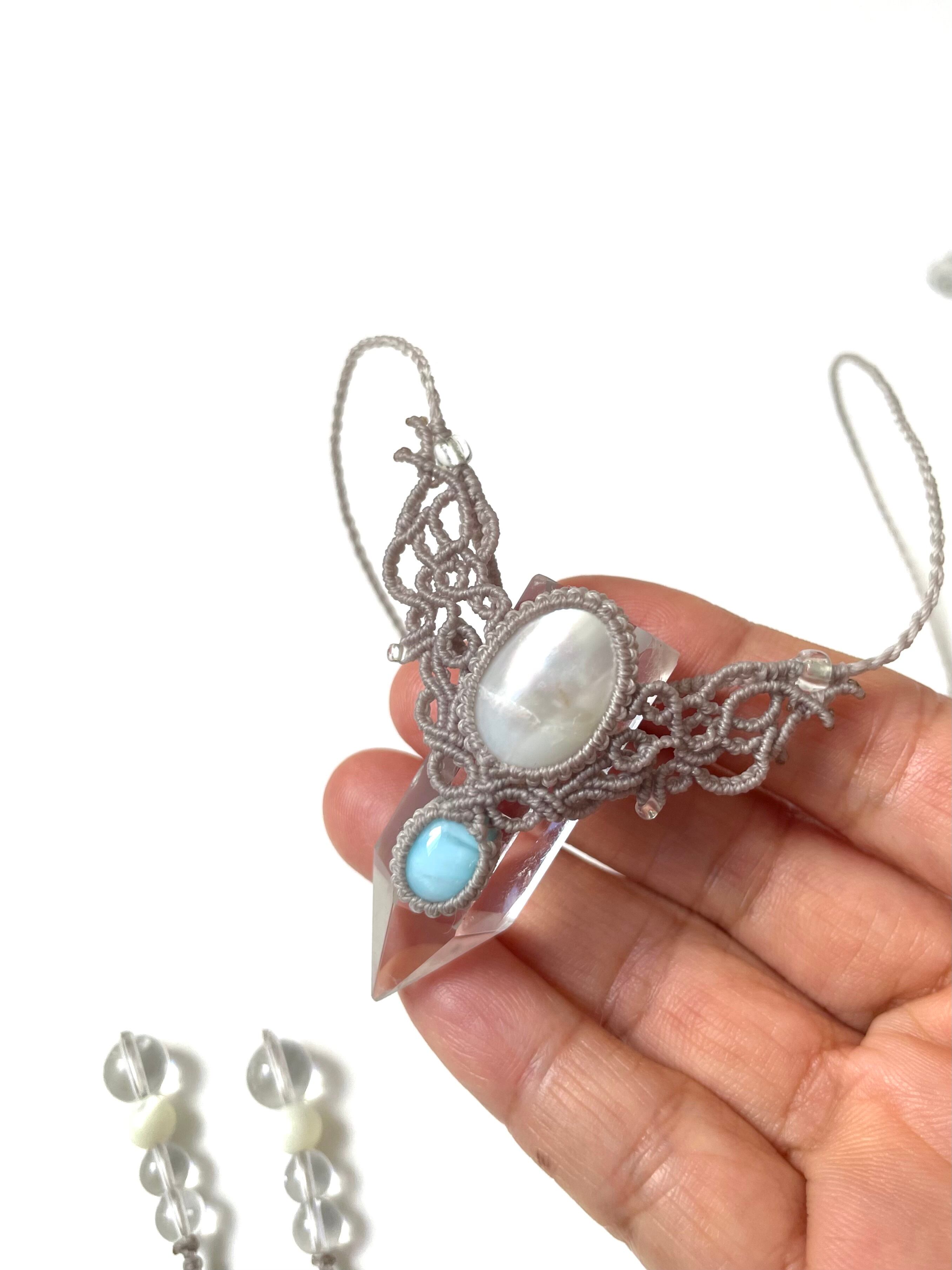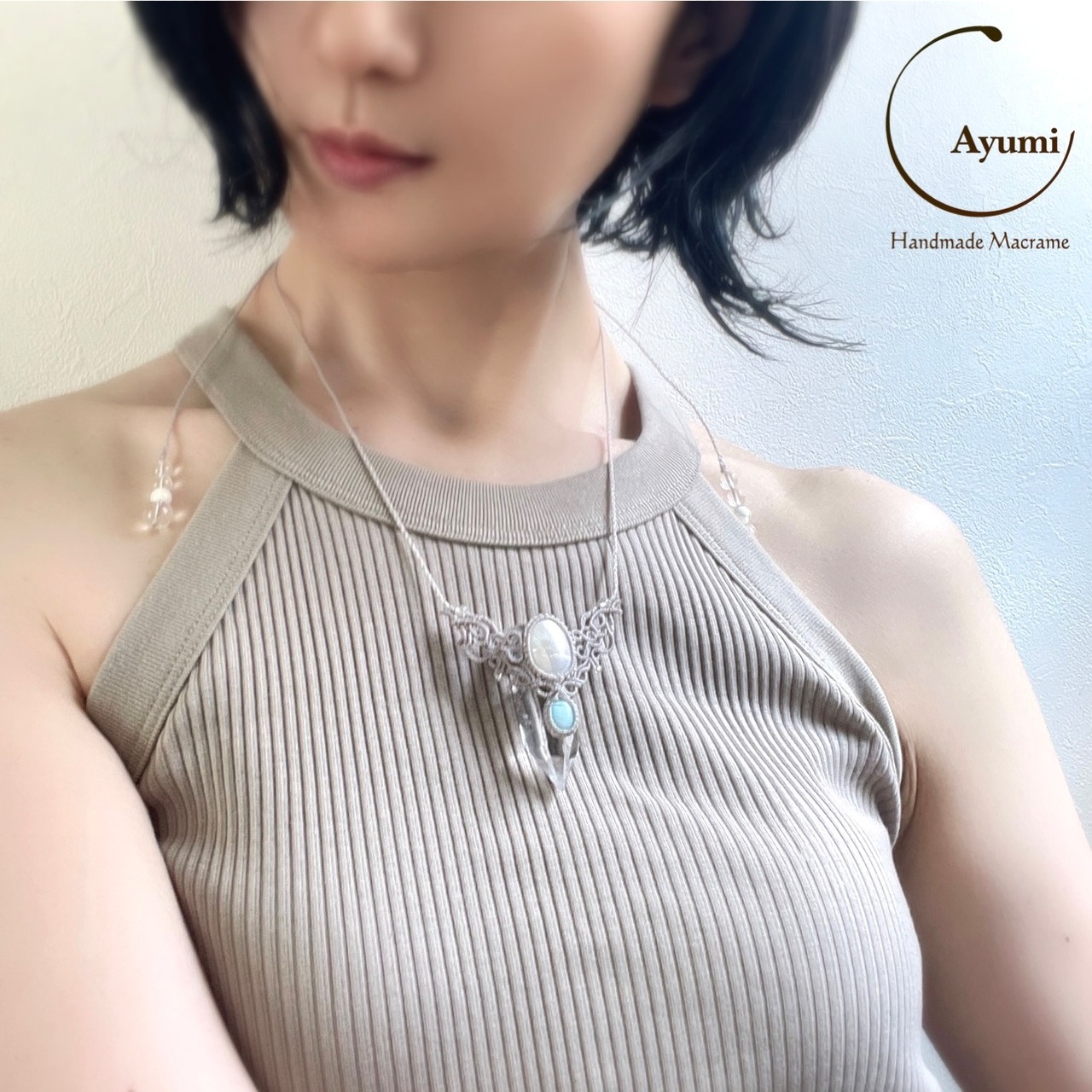 マザーオブパールとラリマー・水晶ポイントの天然石マクラメ編みネックレス♪♪♪