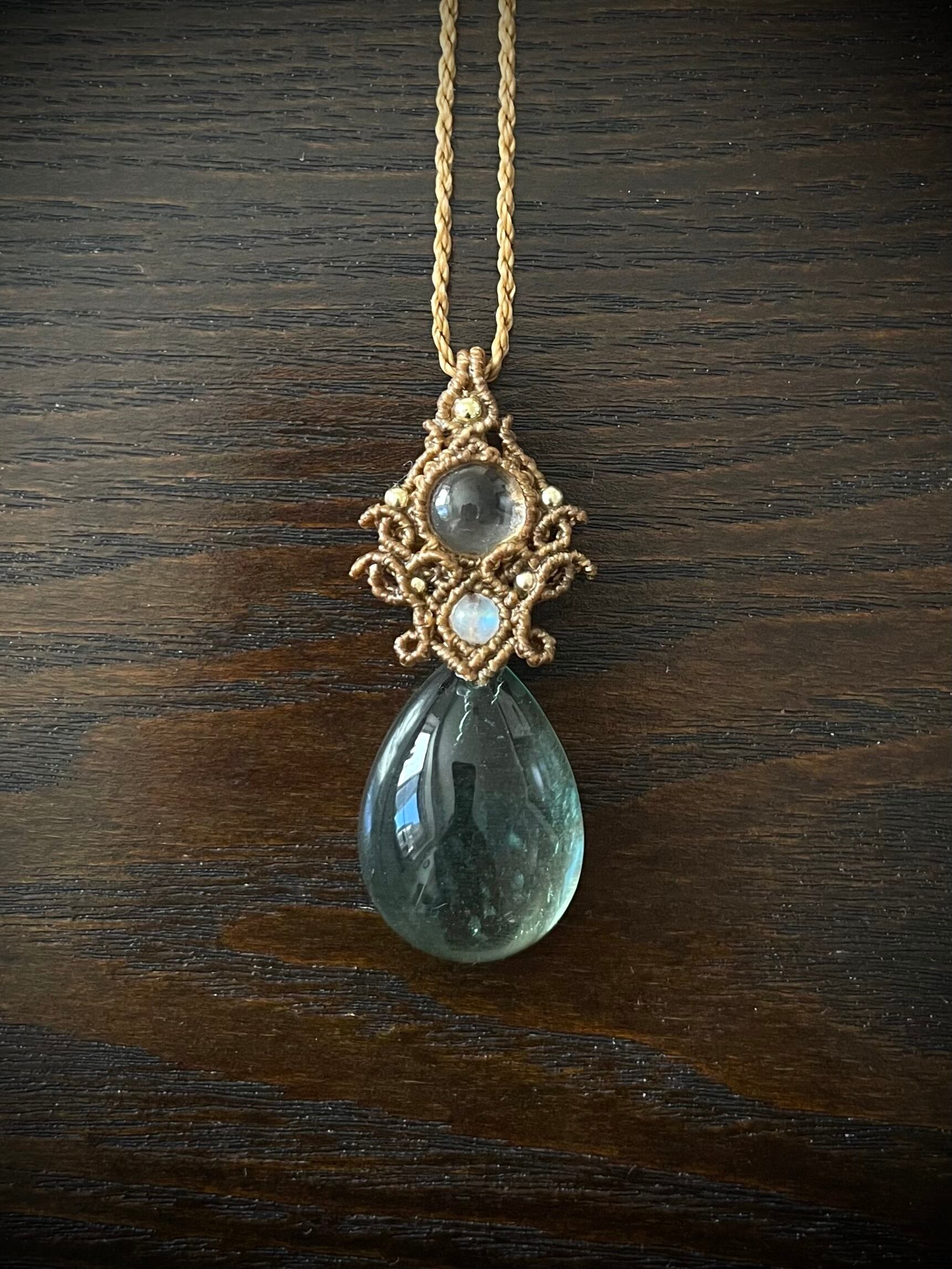 フローライト・クリアクォーツとレインボームーンストーンの天然石マクラメ編みネックレス♪♪♪