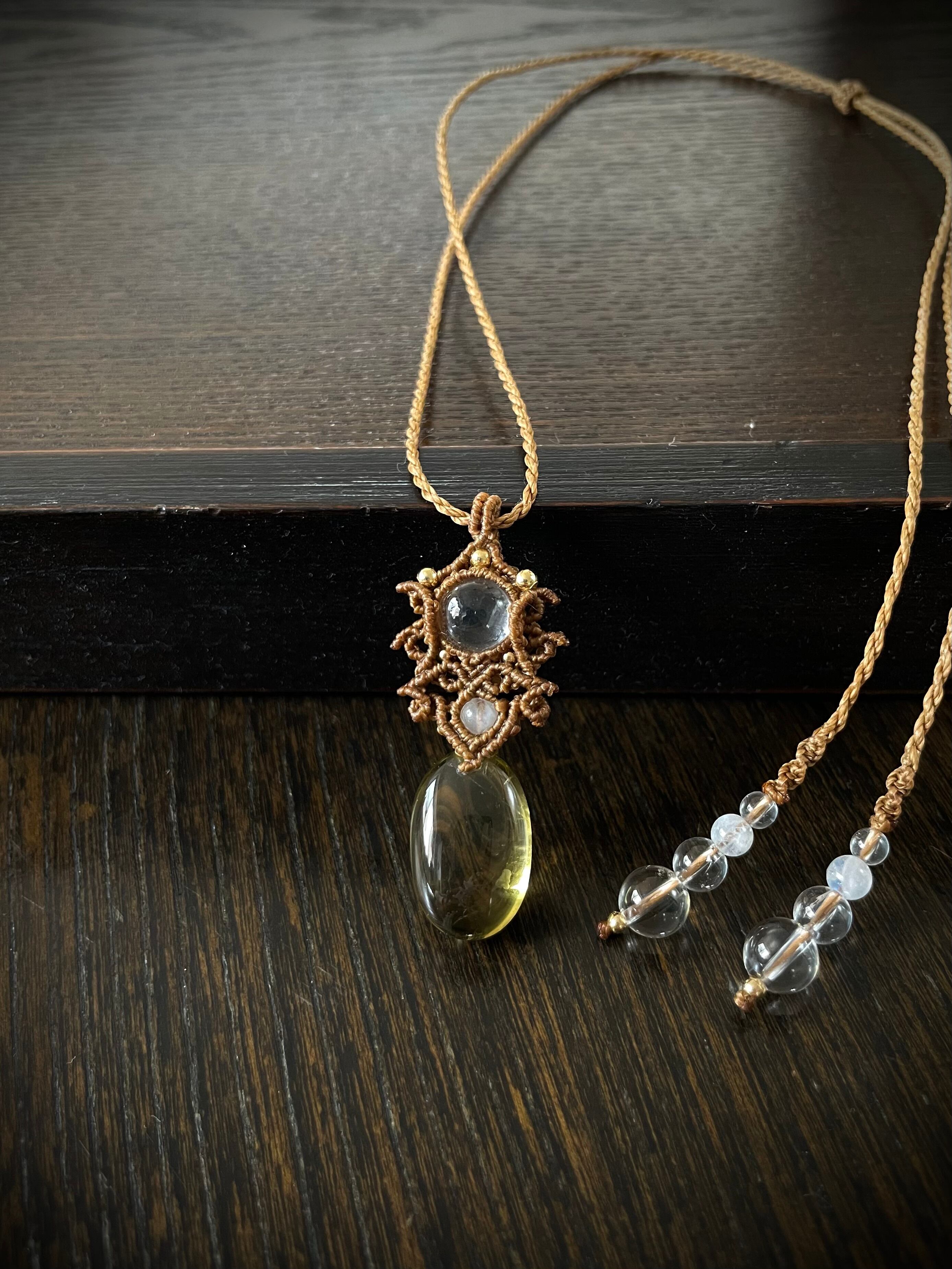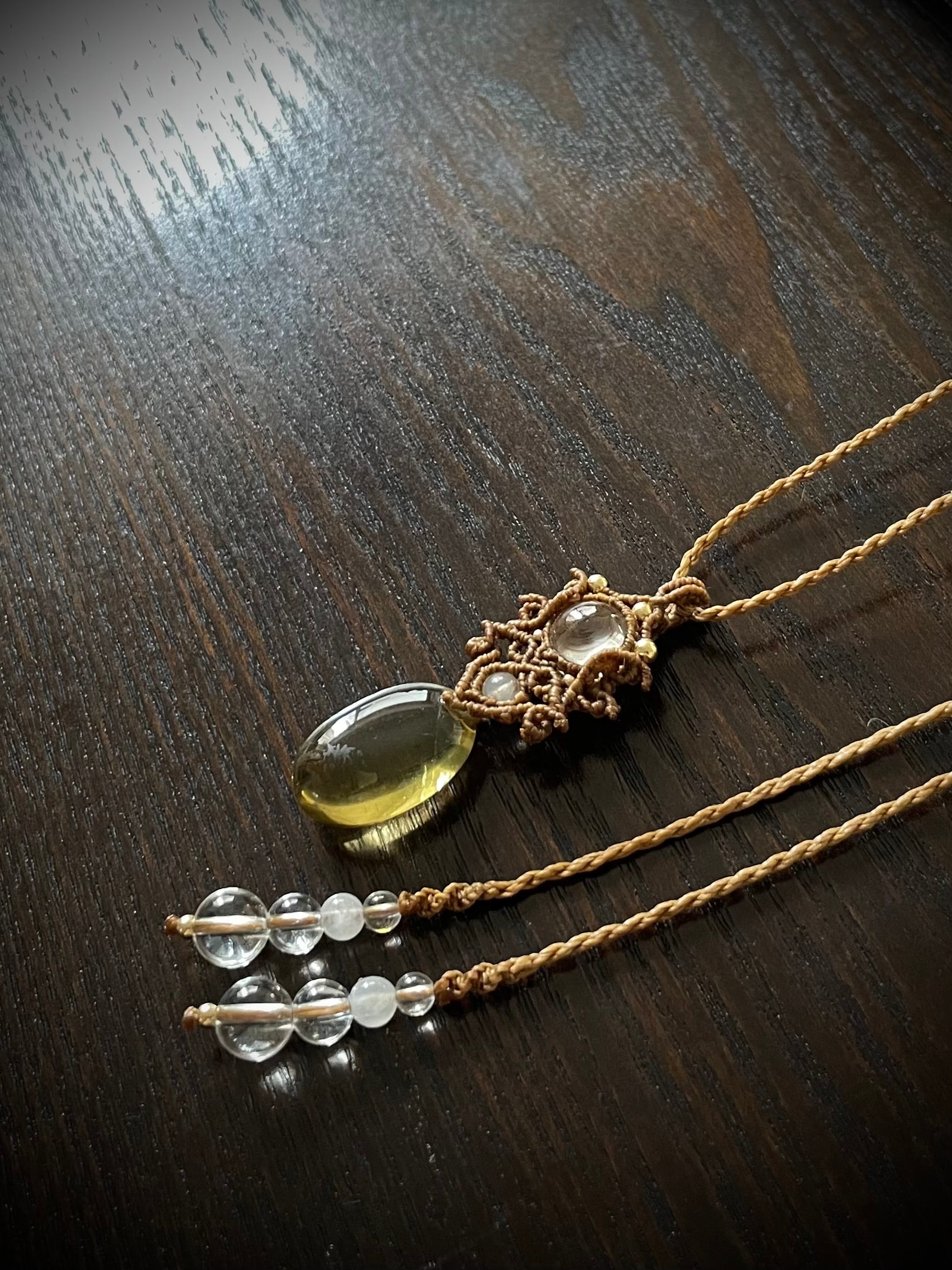 幸せ色のレモンクォーツとクリアクォーツの天然石アクセサリー・マクラメ編みネックレス