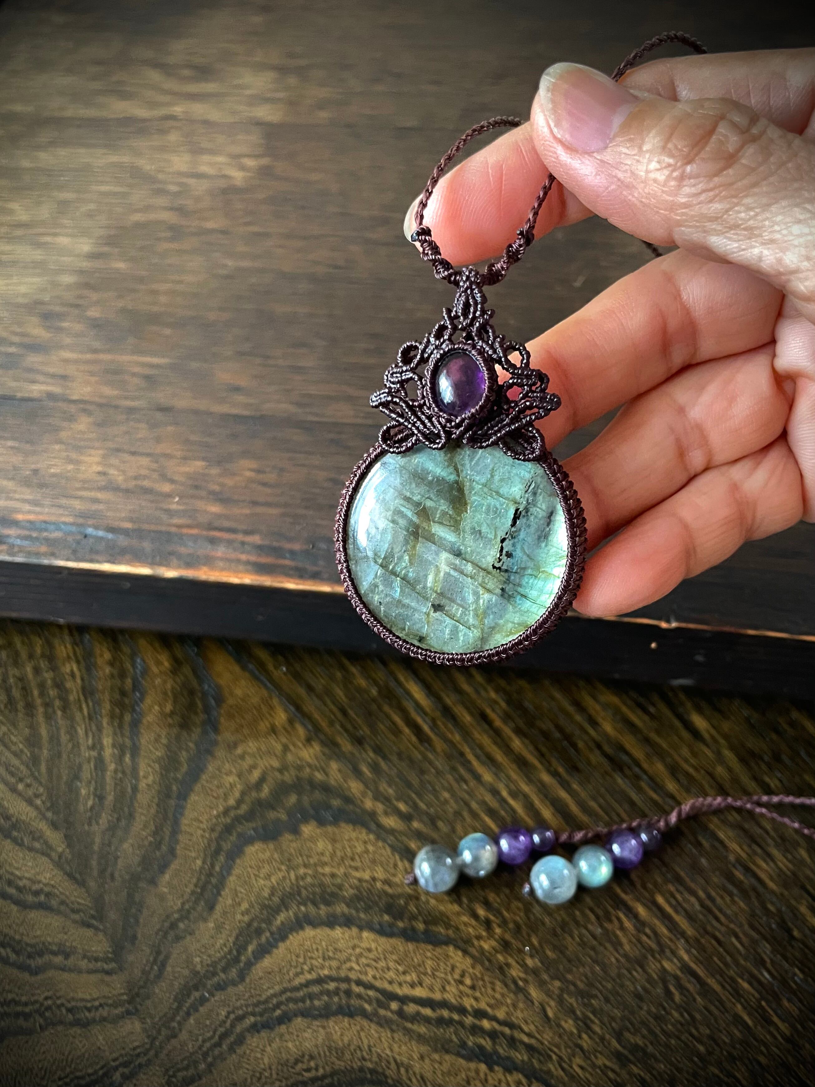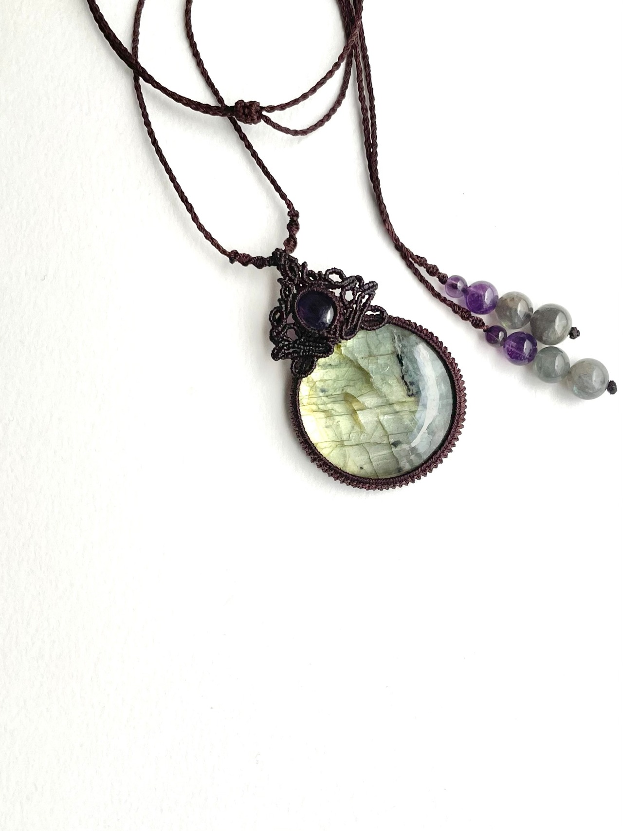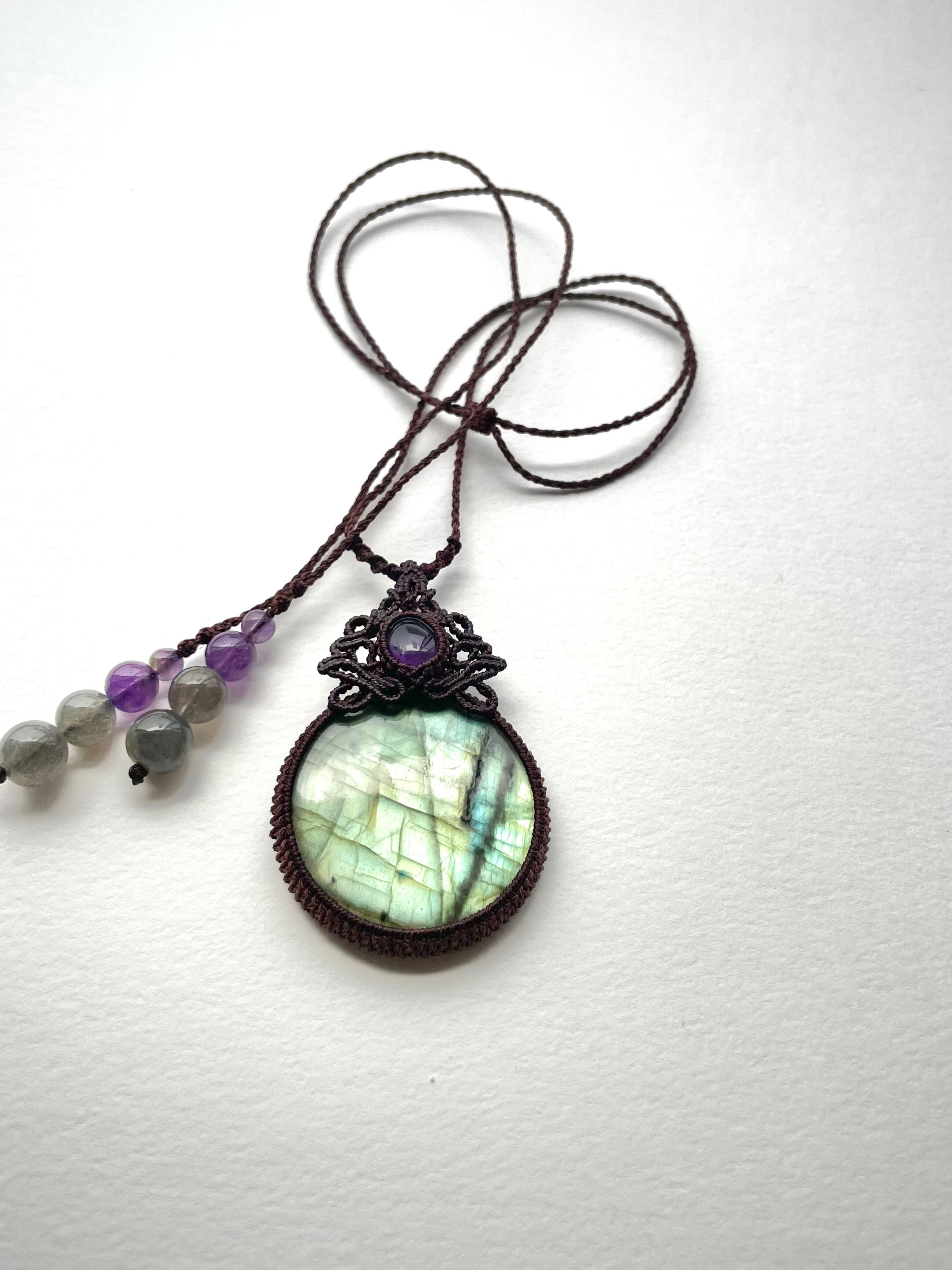 まんまるゴージャスラブラドライトとアメジストの天然石マクラメ編みネックレス♪