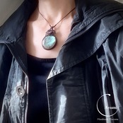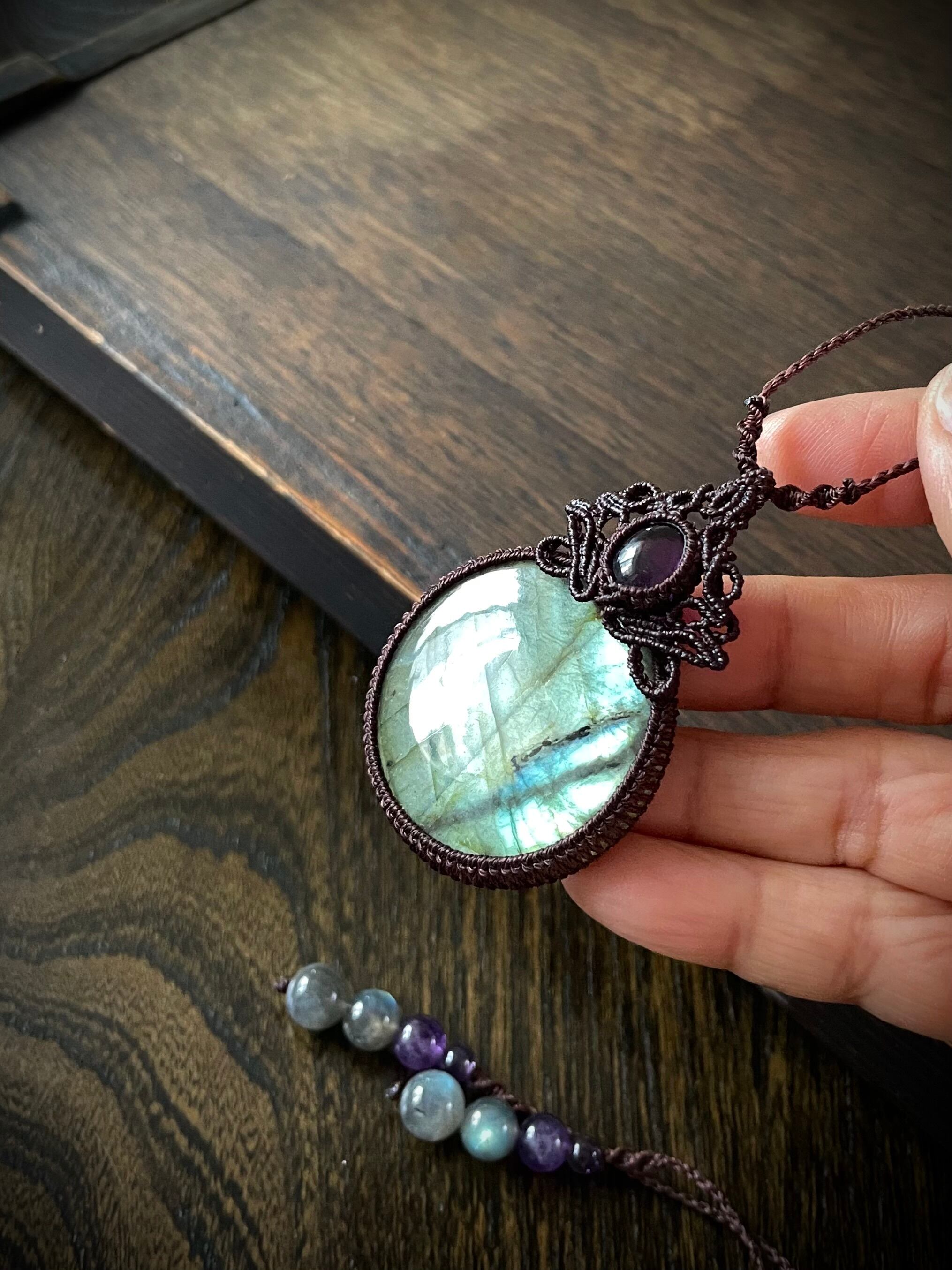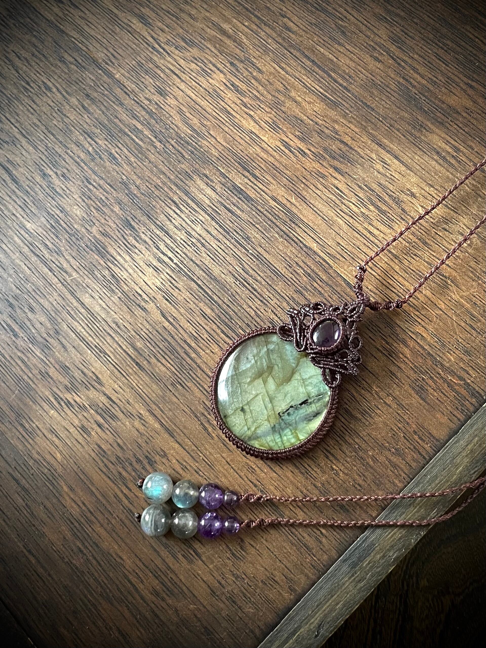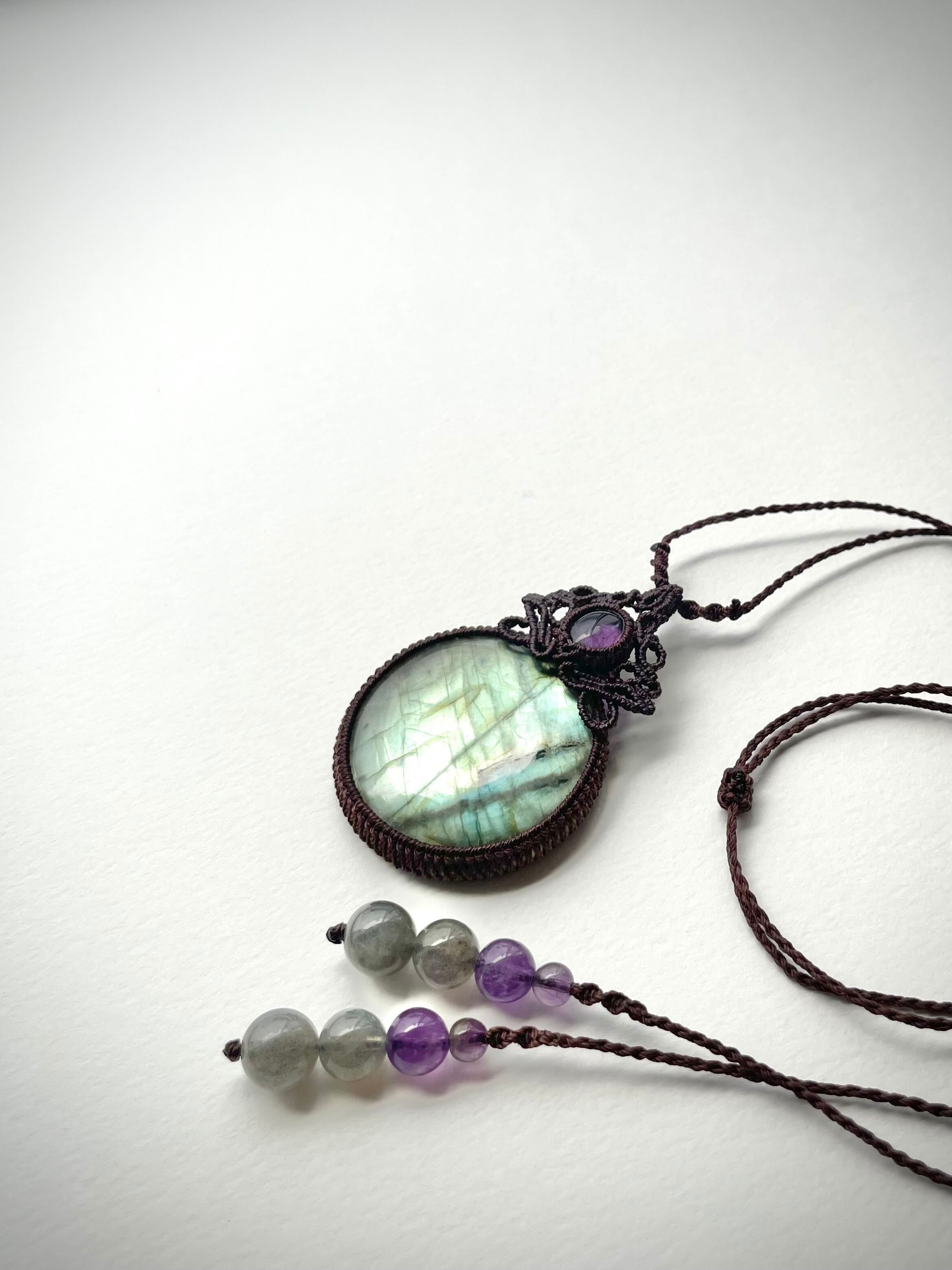 まんまるゴージャスラブラドライトとアメジストの天然石マクラメ編みネックレス♪