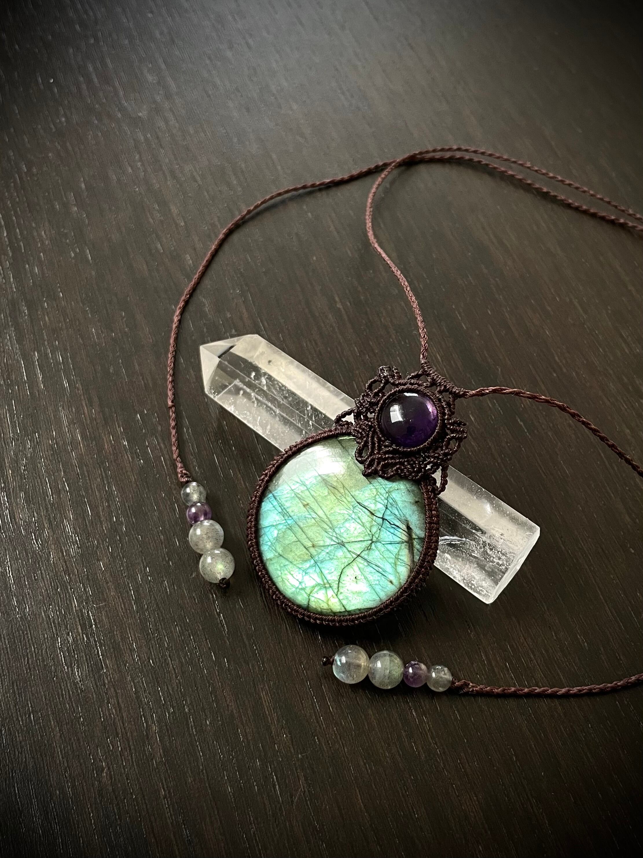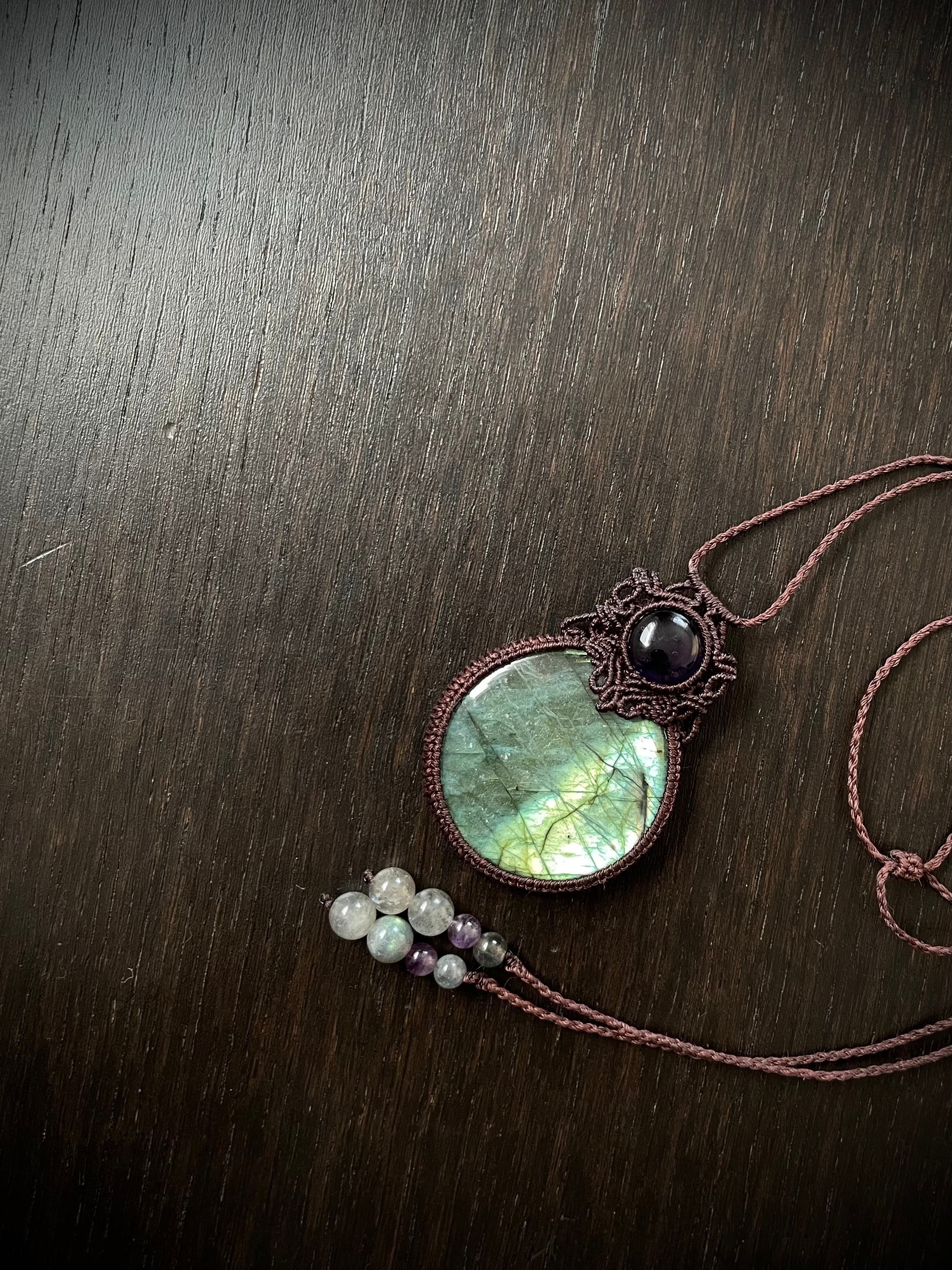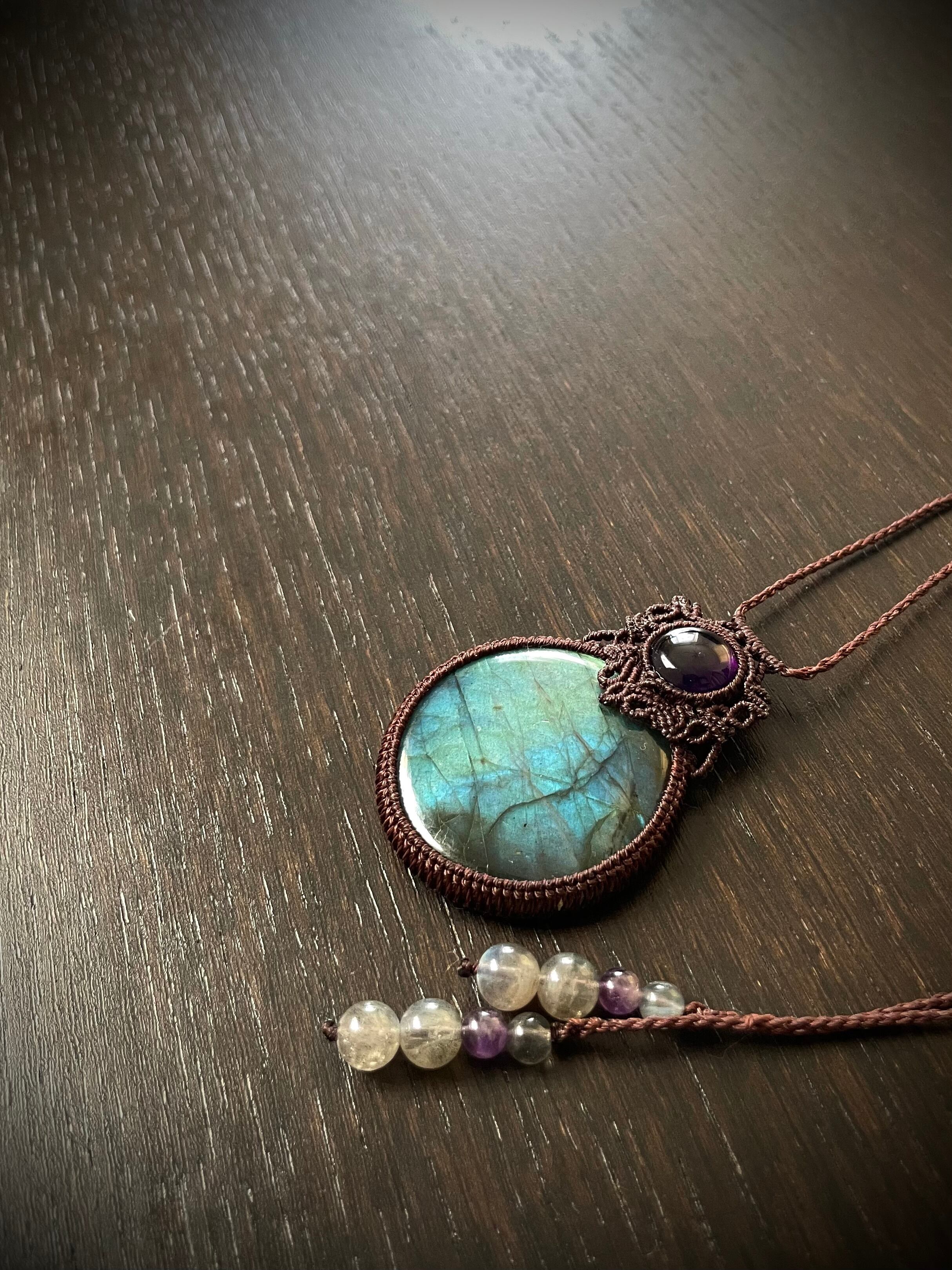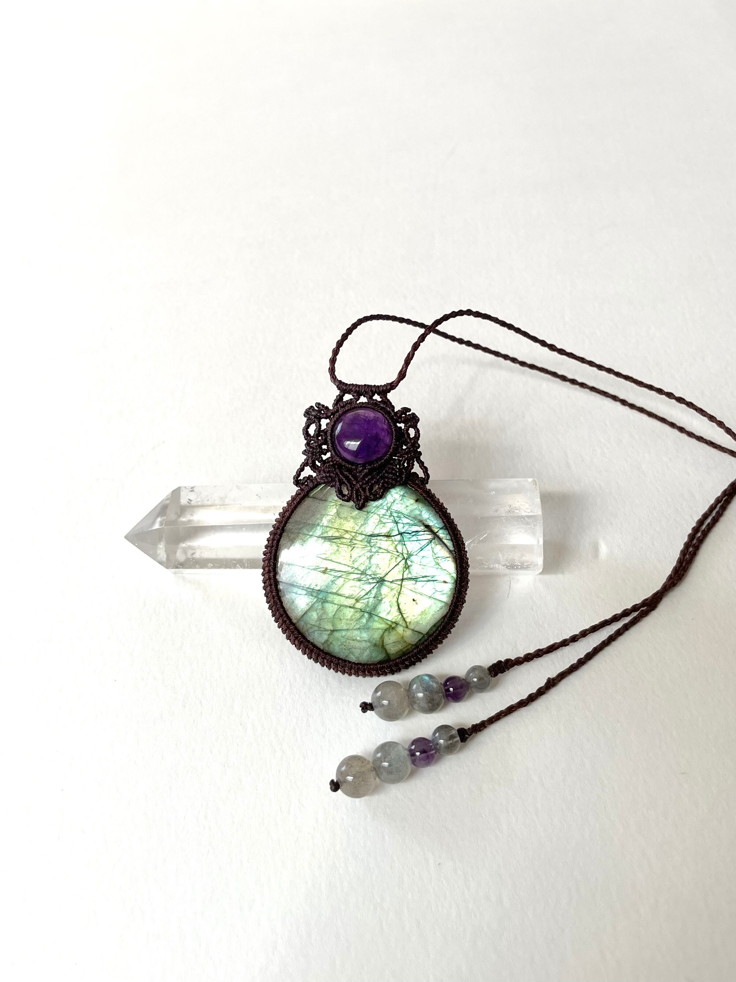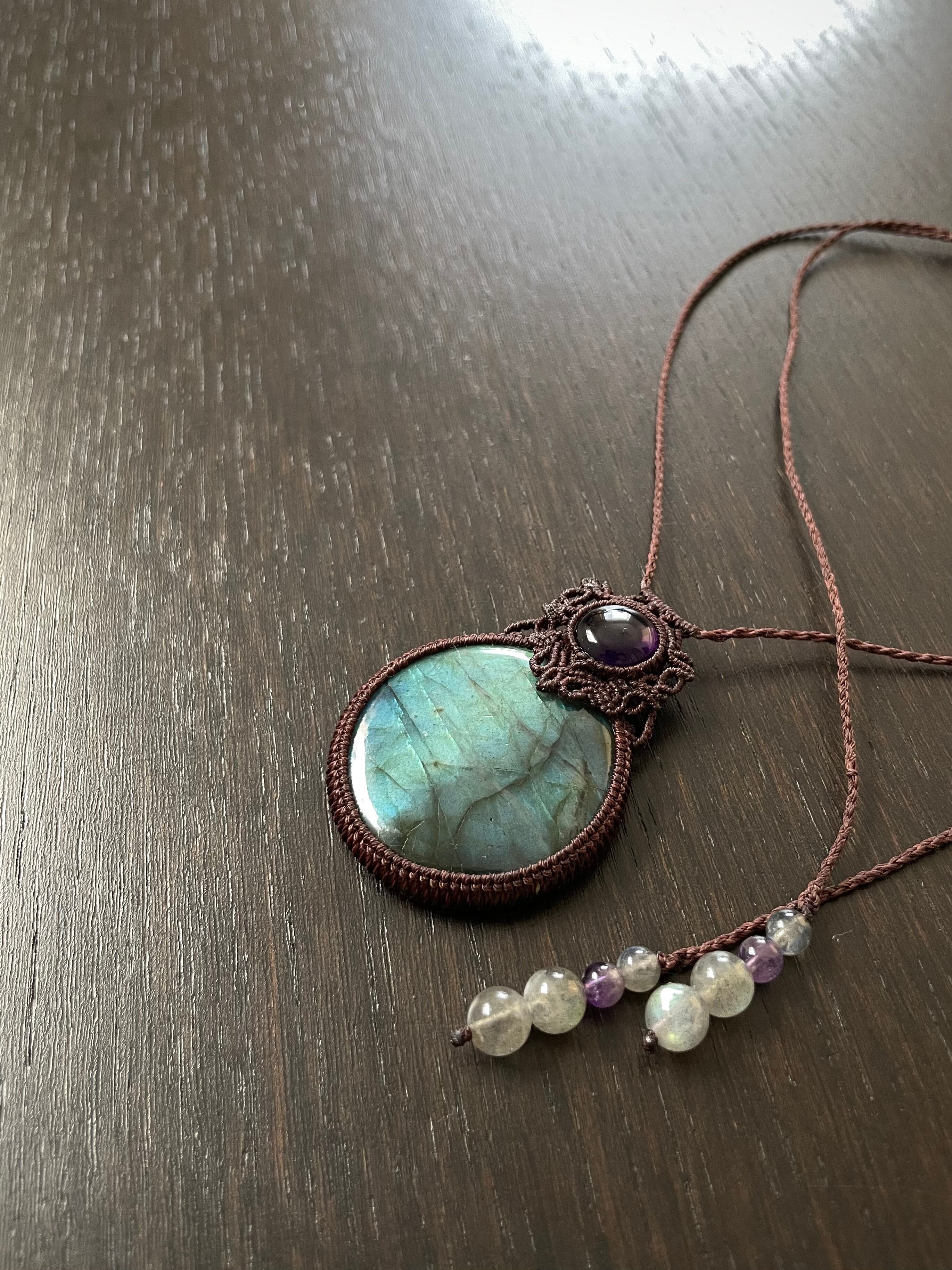 まんまるゴージャスラブラドライトとアメジストの天然石マクラメ編みネックレス♪