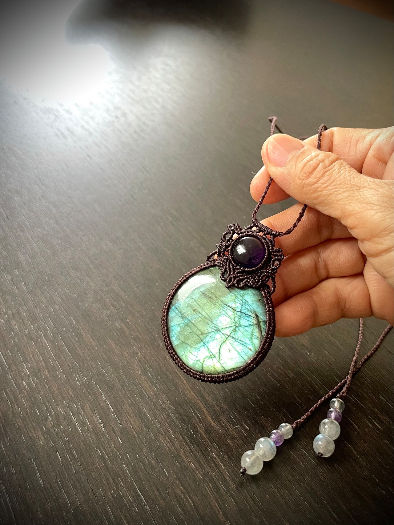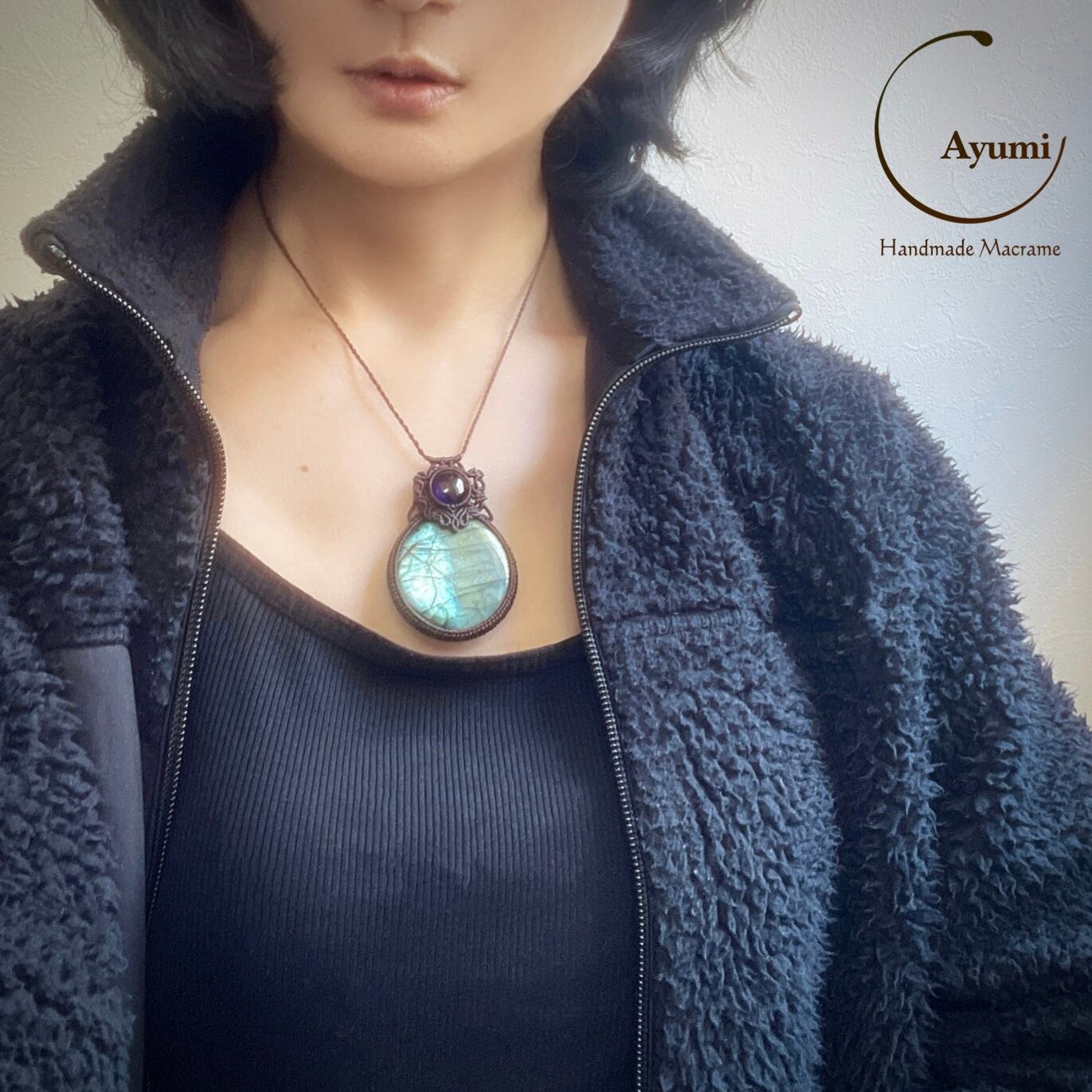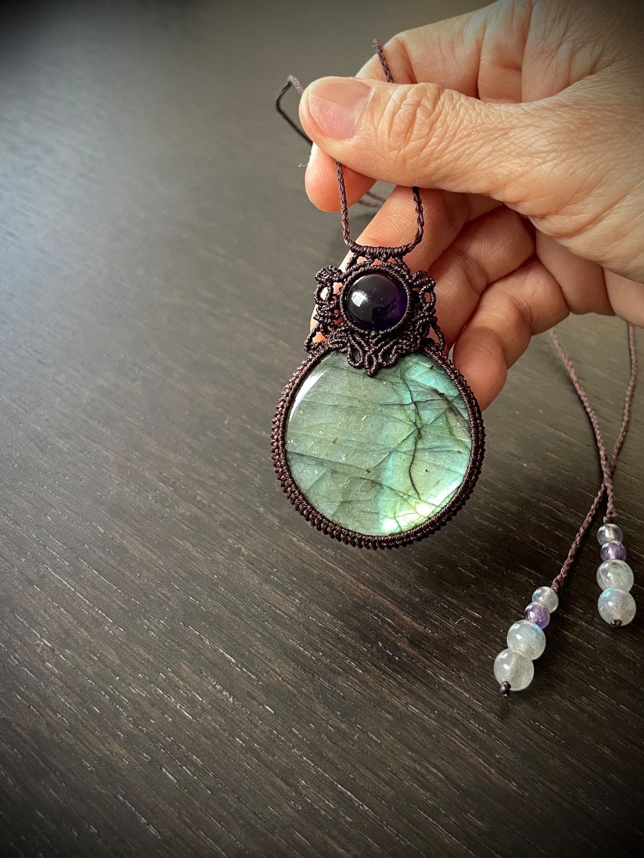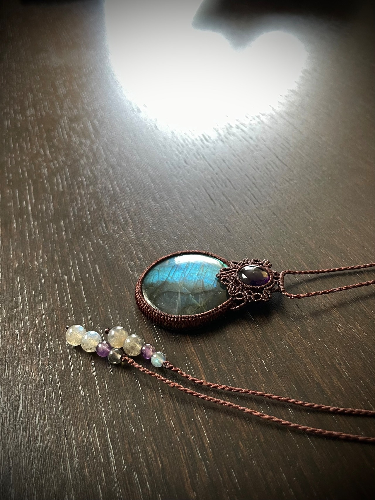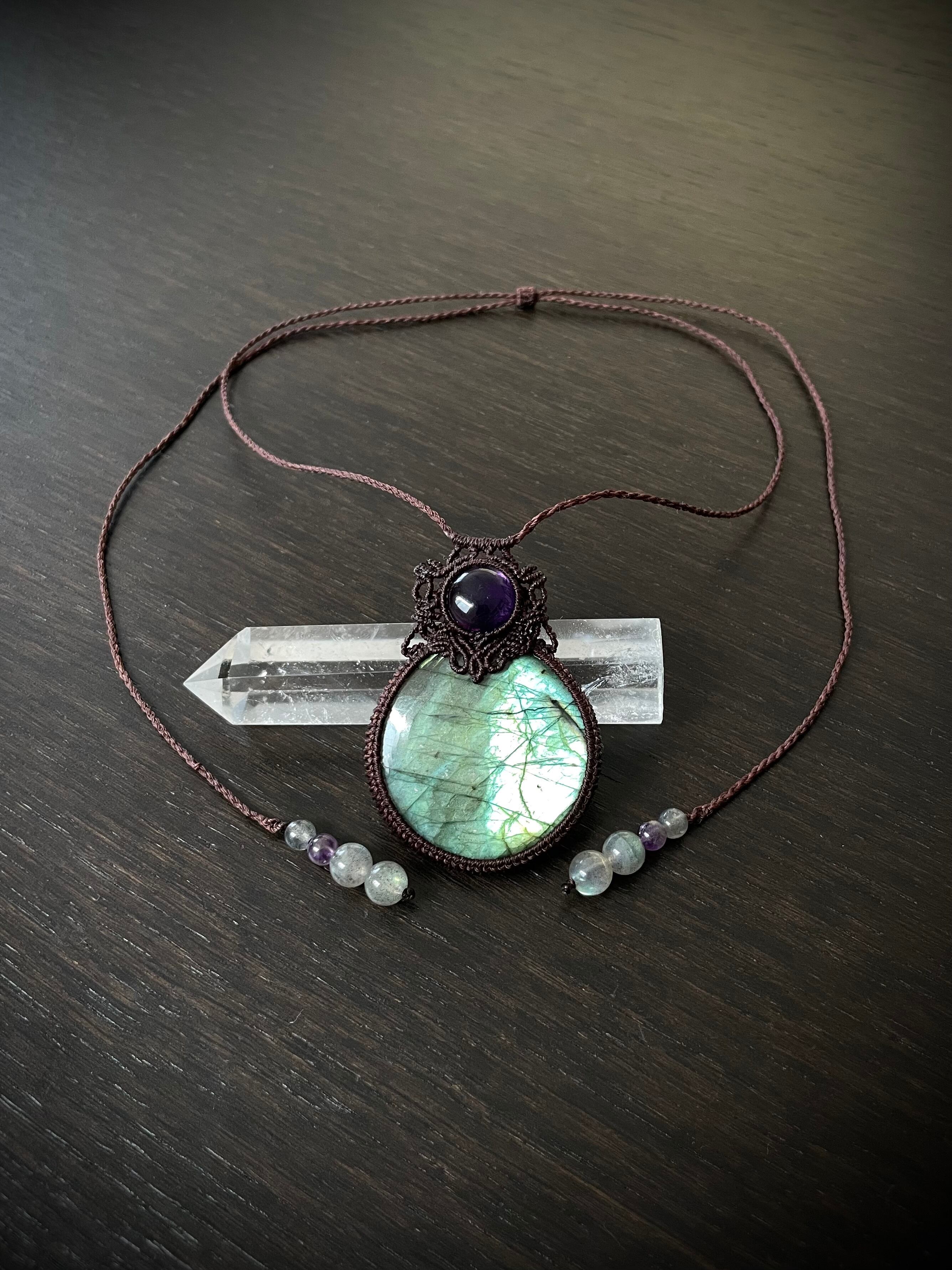 まんまるゴージャスラブラドライトとアメジストの天然石マクラメ編みネックレス♪