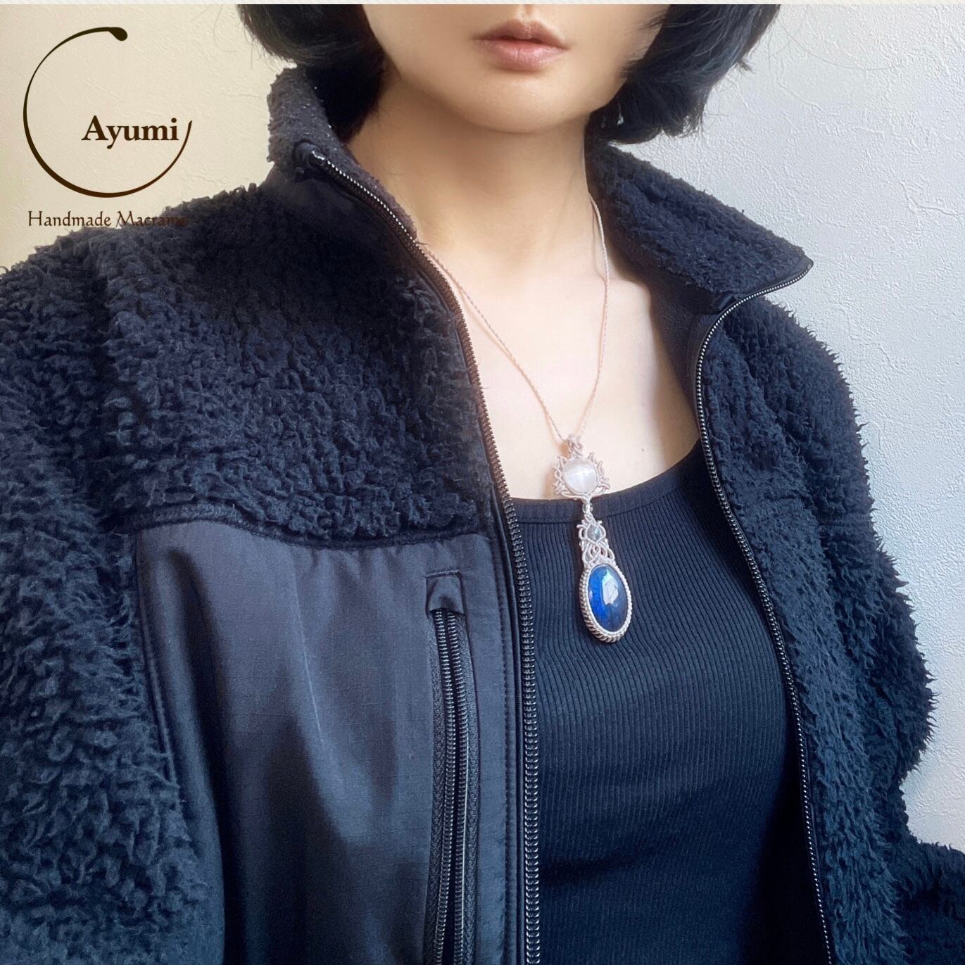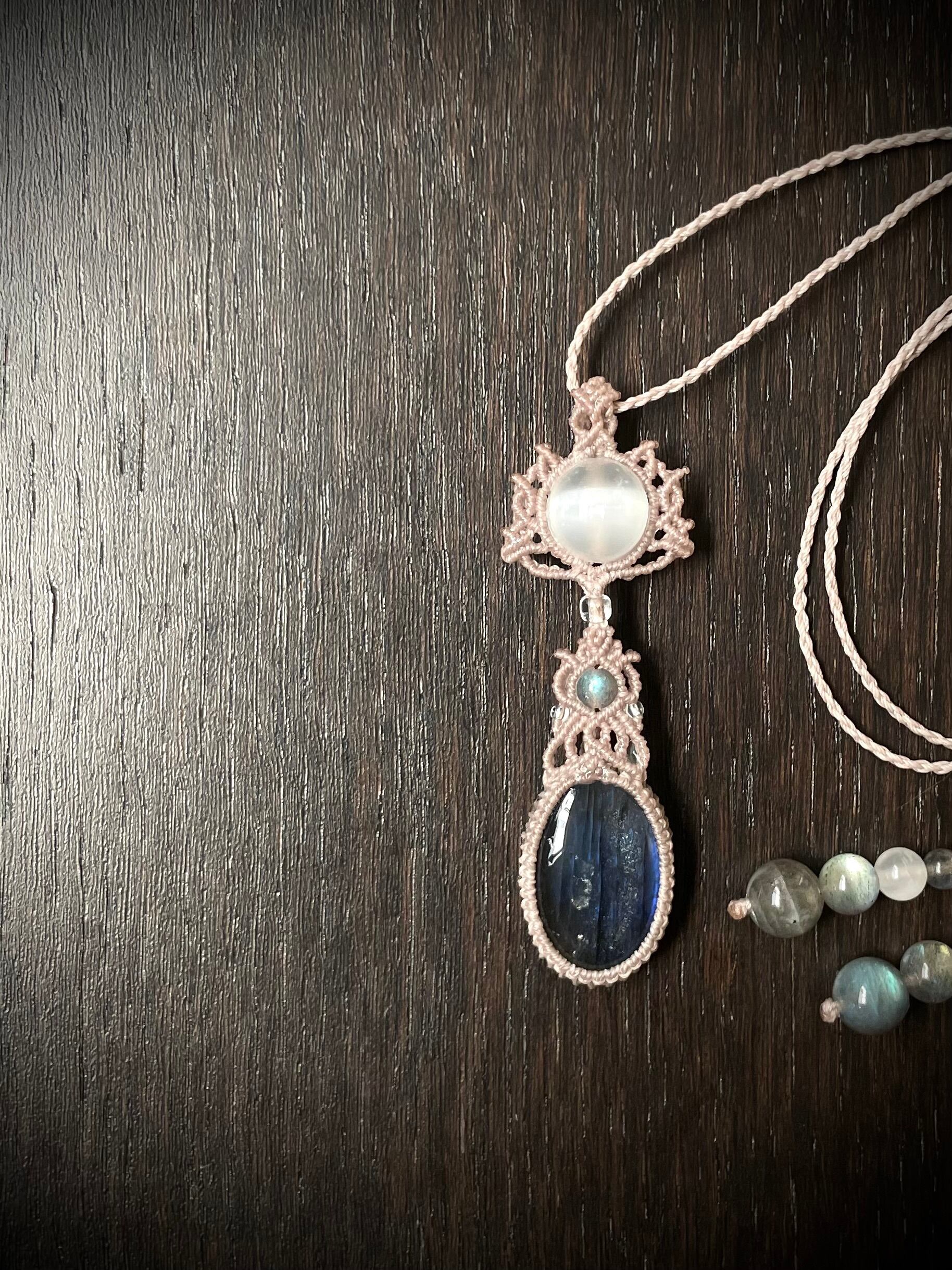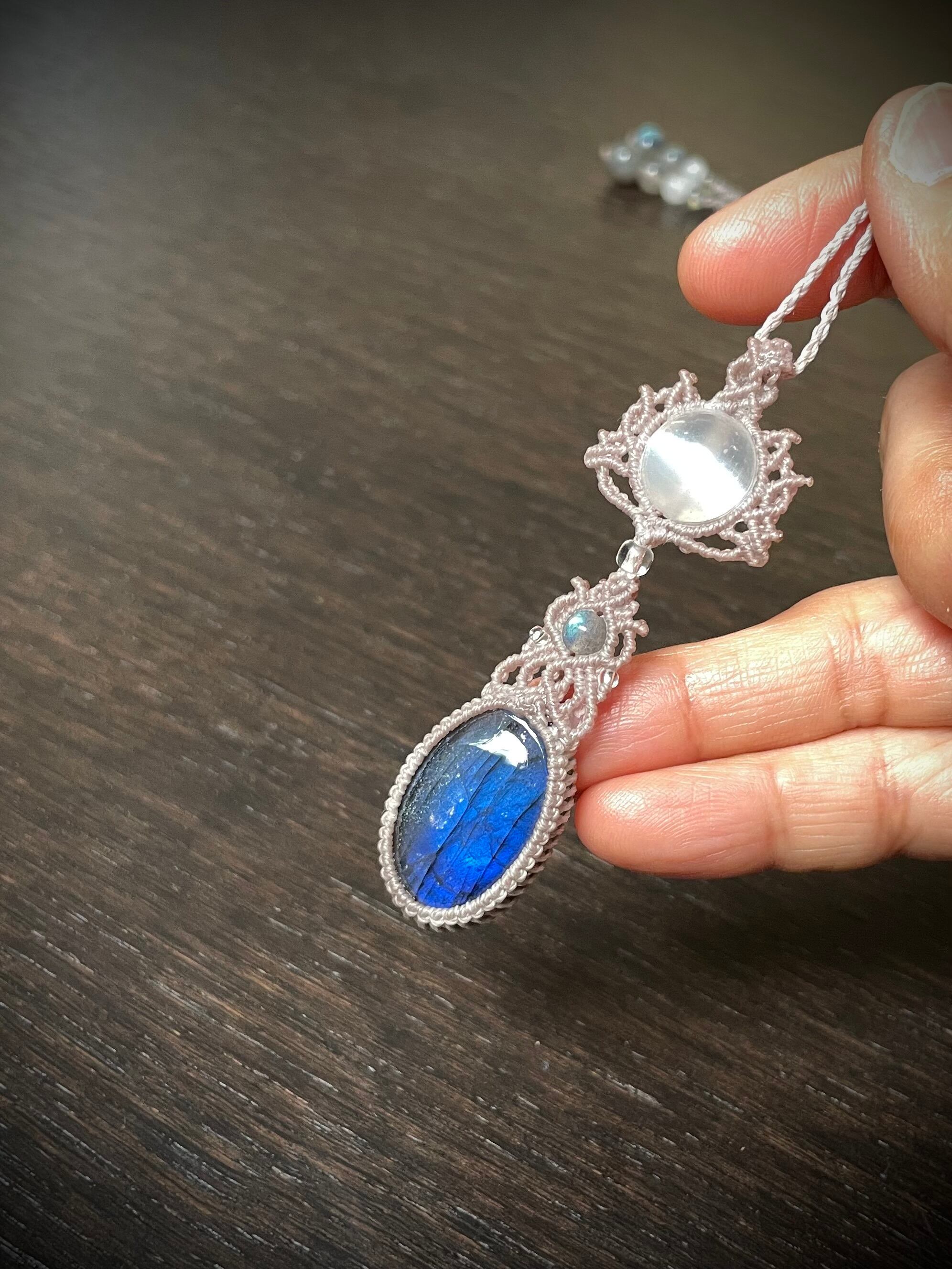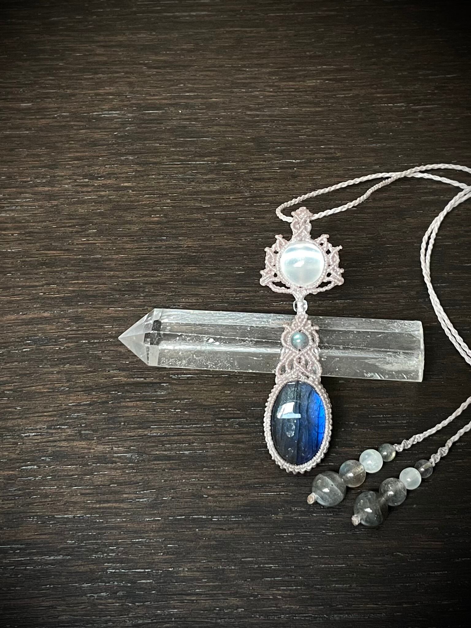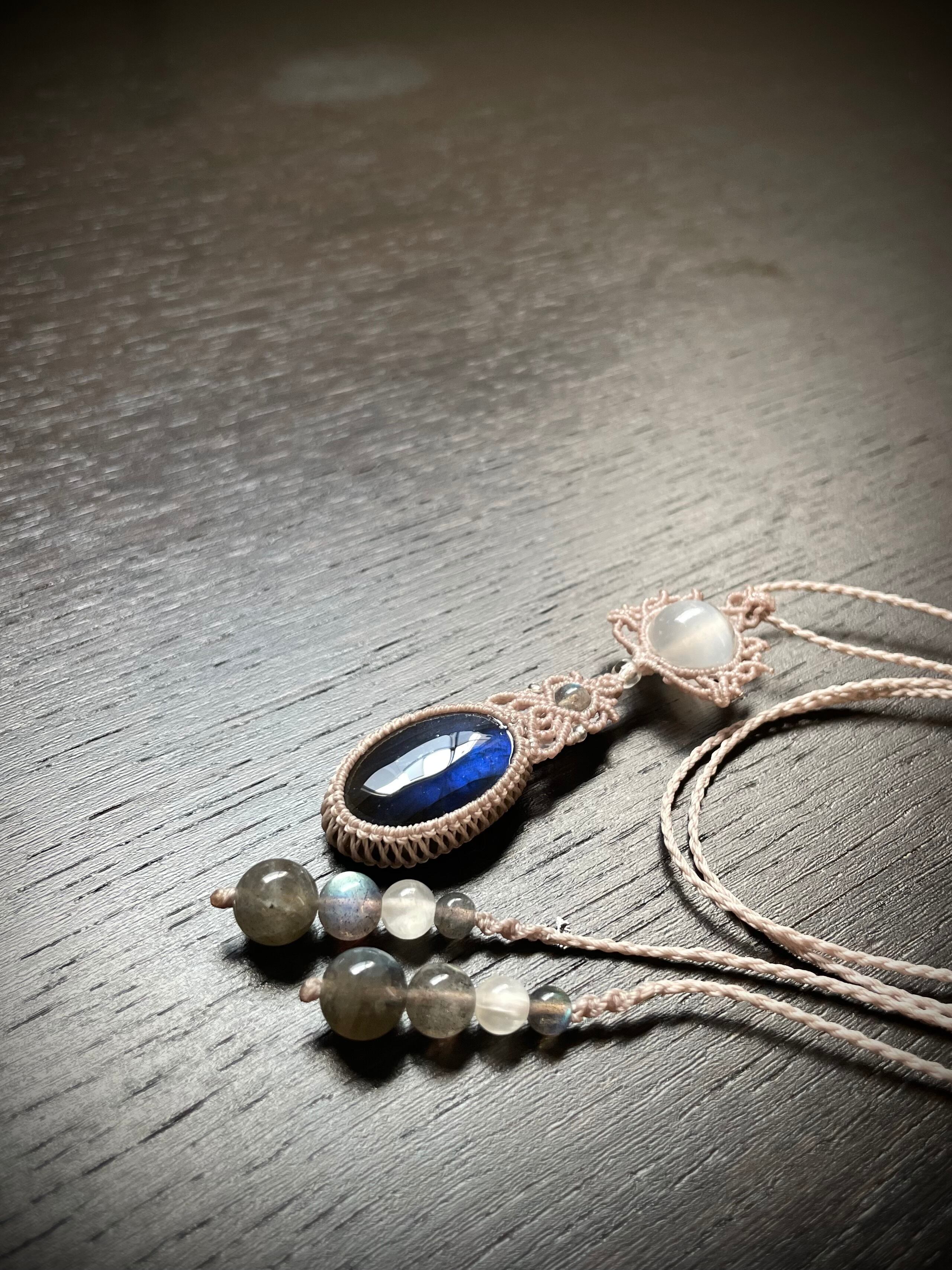 セレナイトとラブラドライトの天然石マクラメ編みネックレス♪