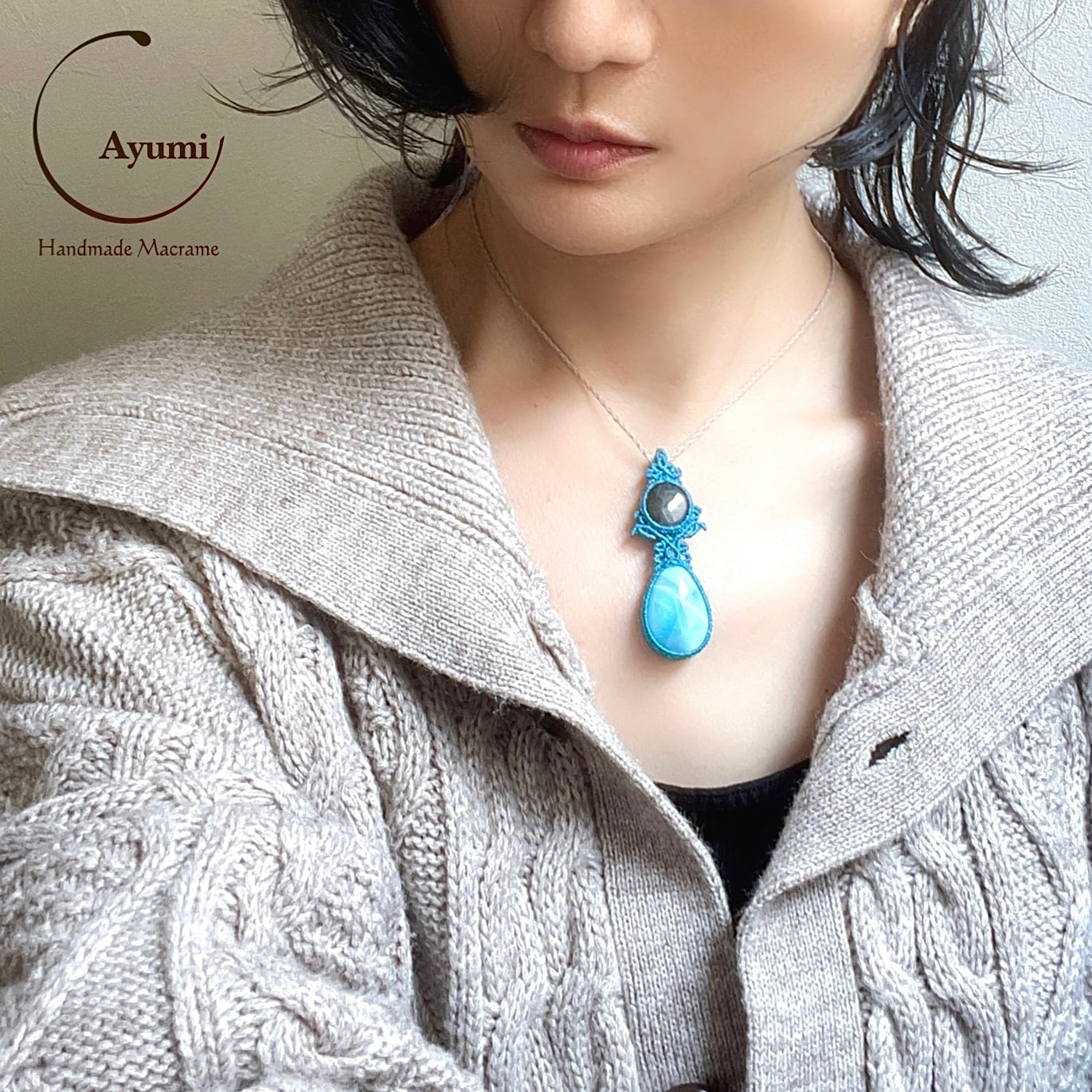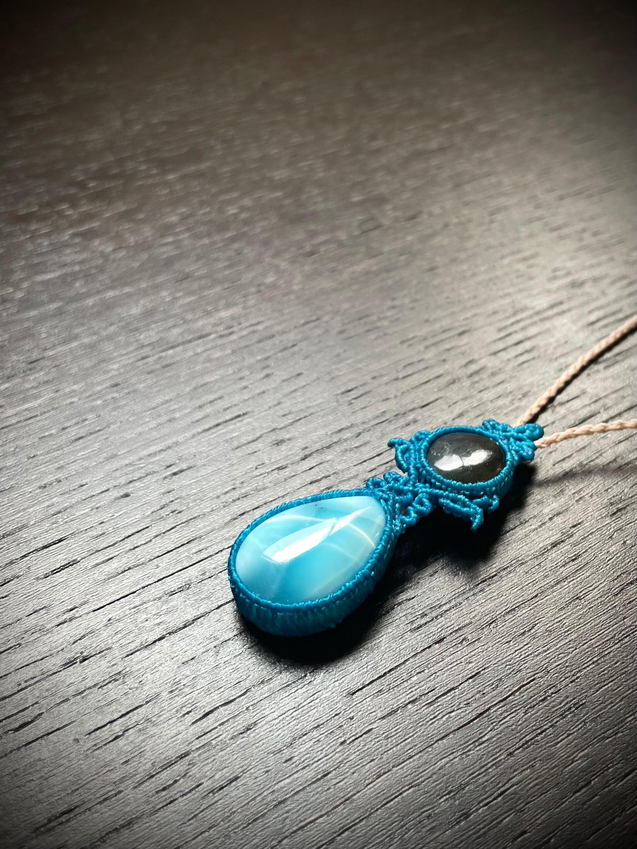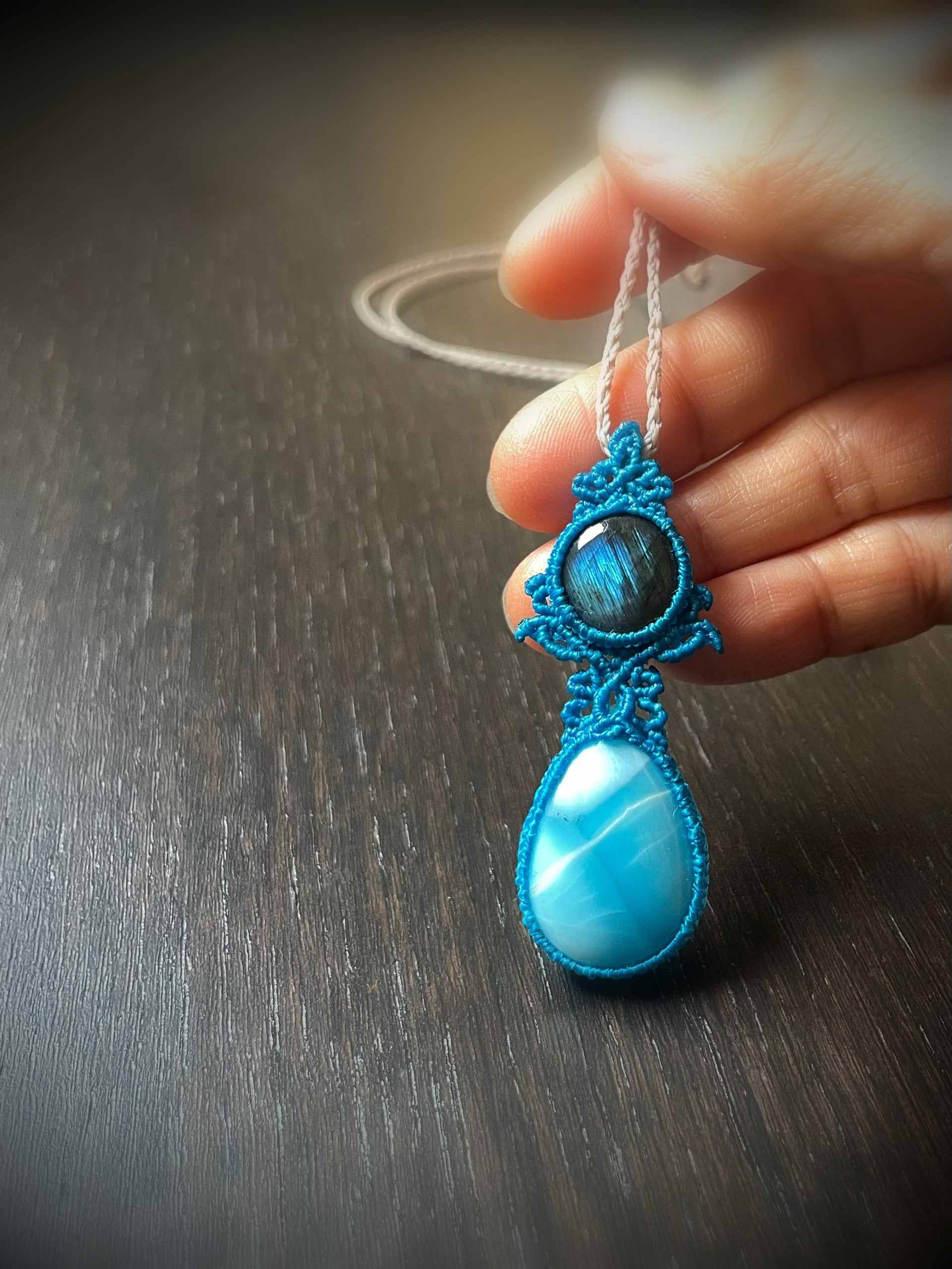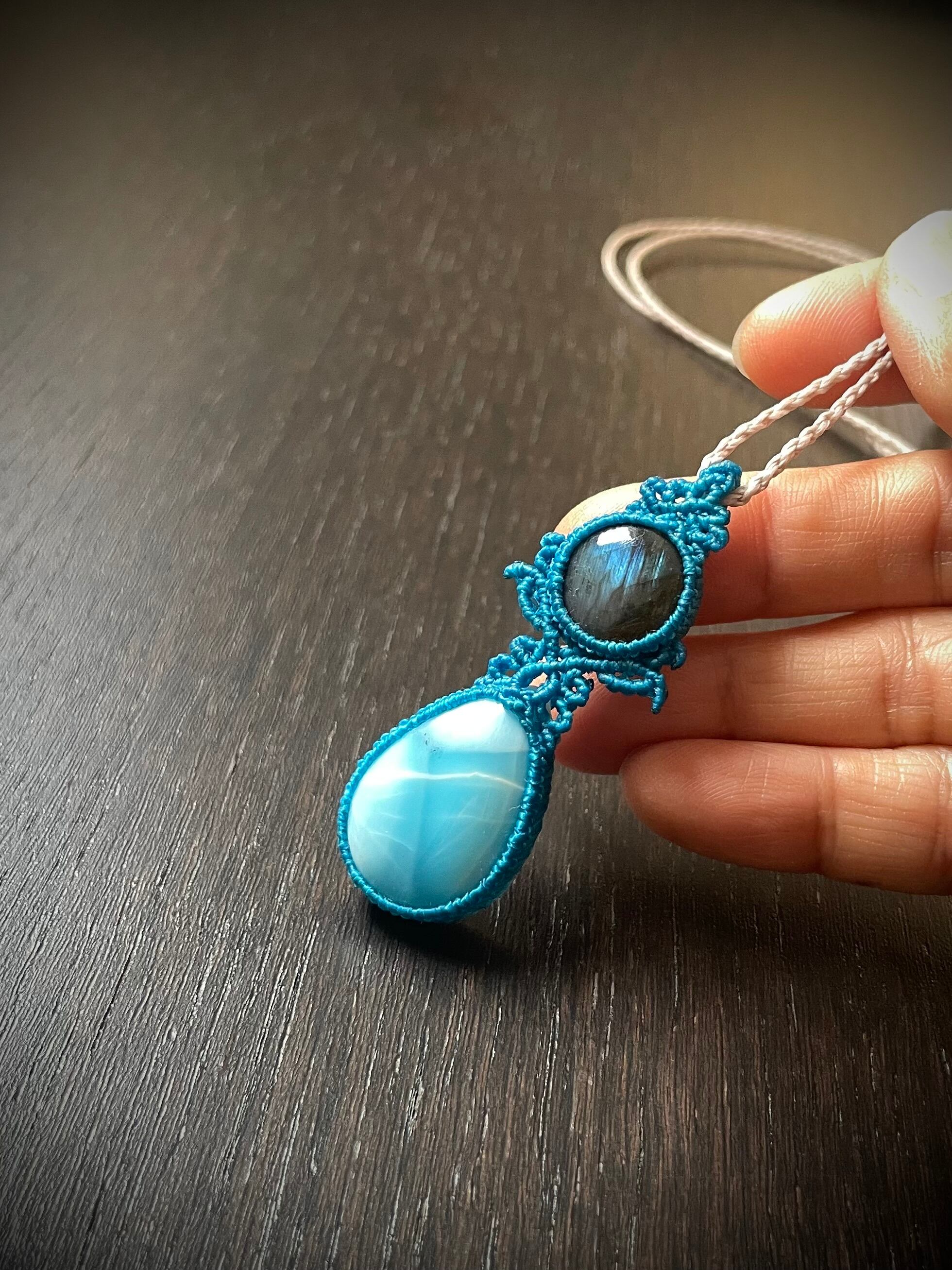 ラブラドライトとラリマーの天然石マクラメ編みネックレス♪