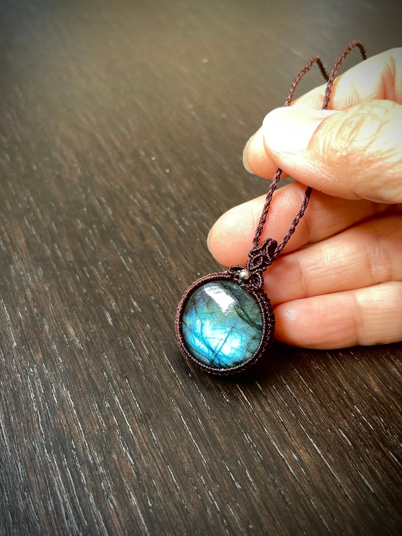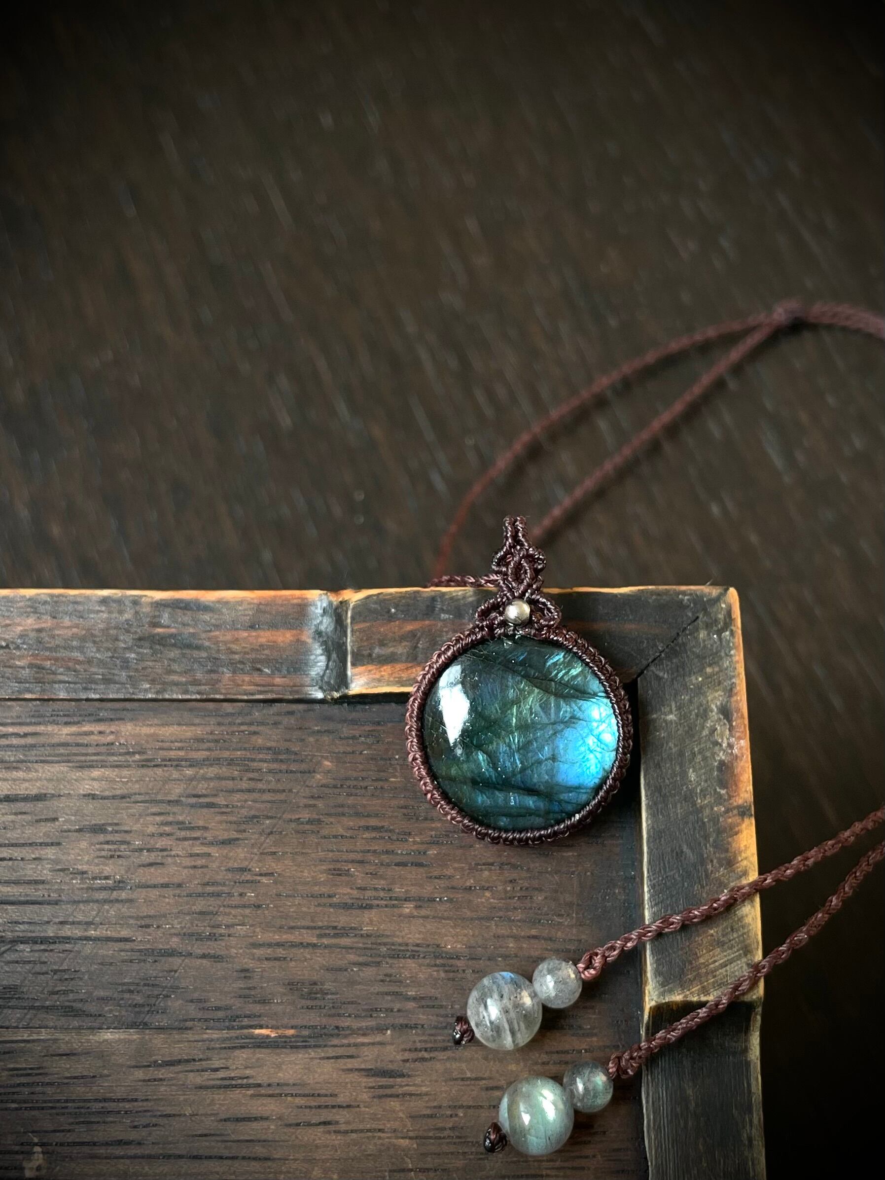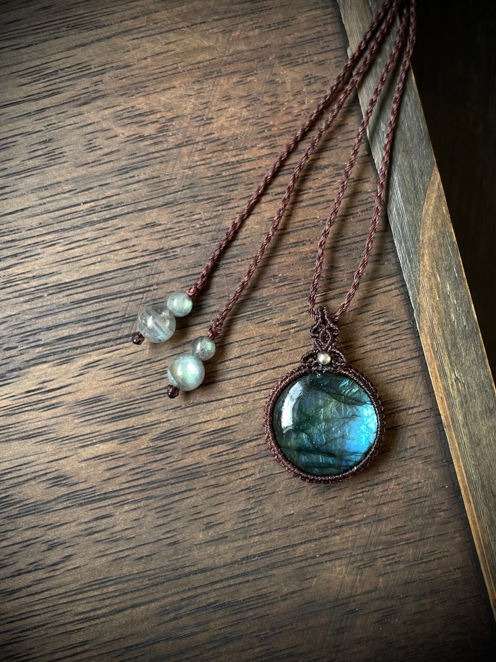 まんまるラブラドライトの天然石マクラメ編みネックレス♪