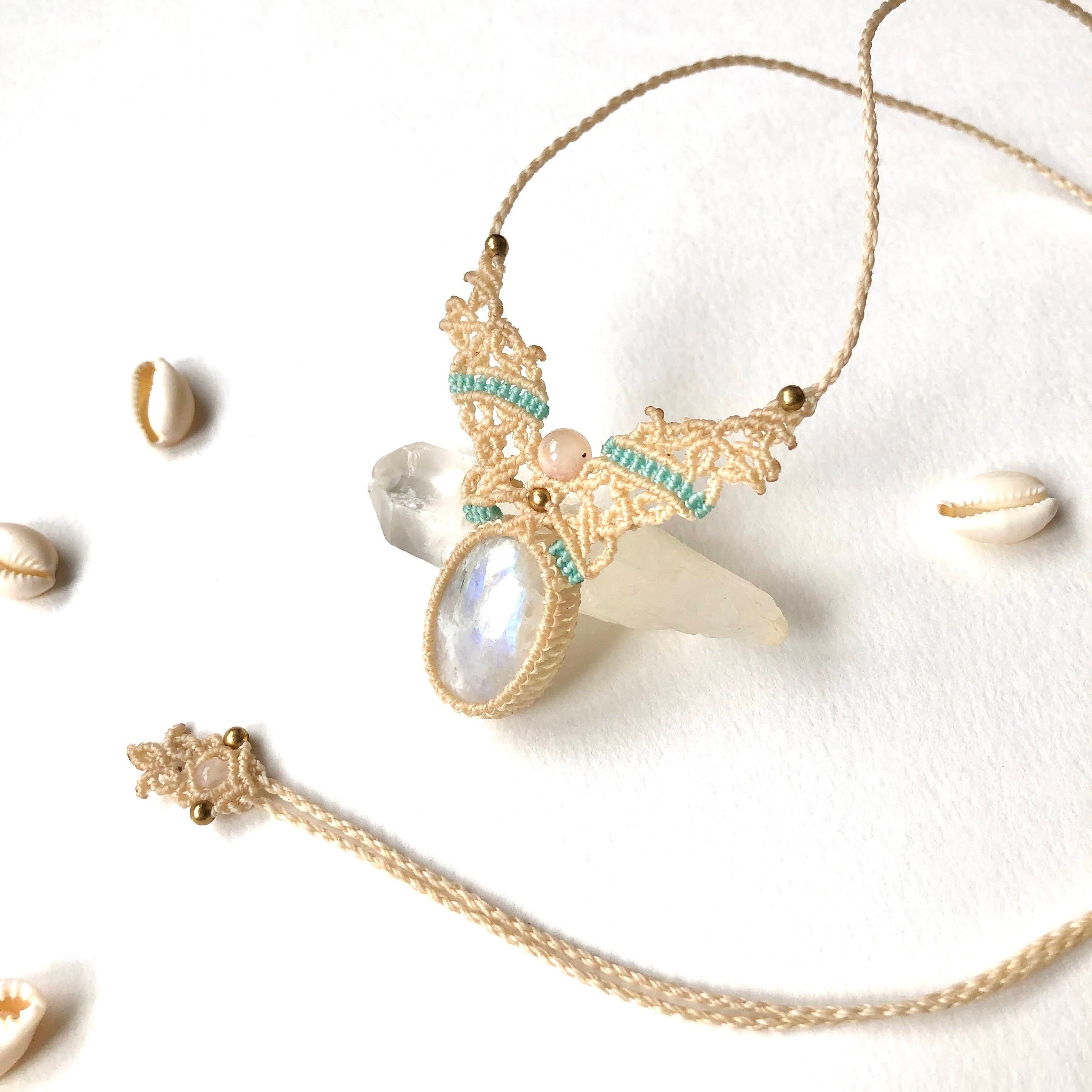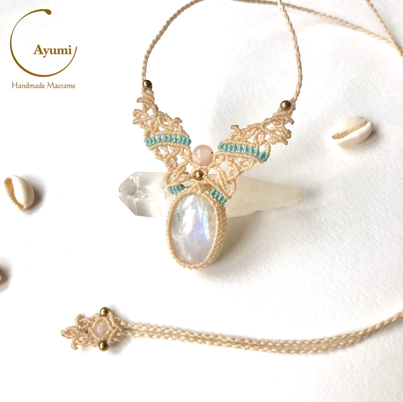 マクラメの細かいモチーフとレインボームーンストーンの組み合わせ。