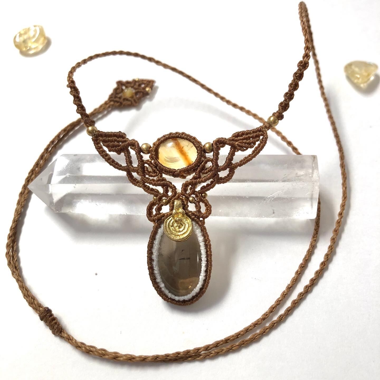 スモーキークォーツ ブラスチャーム シトリン【11月誕生石】 マクラメ ネックレス Smorky quartz and Citrine Necklace