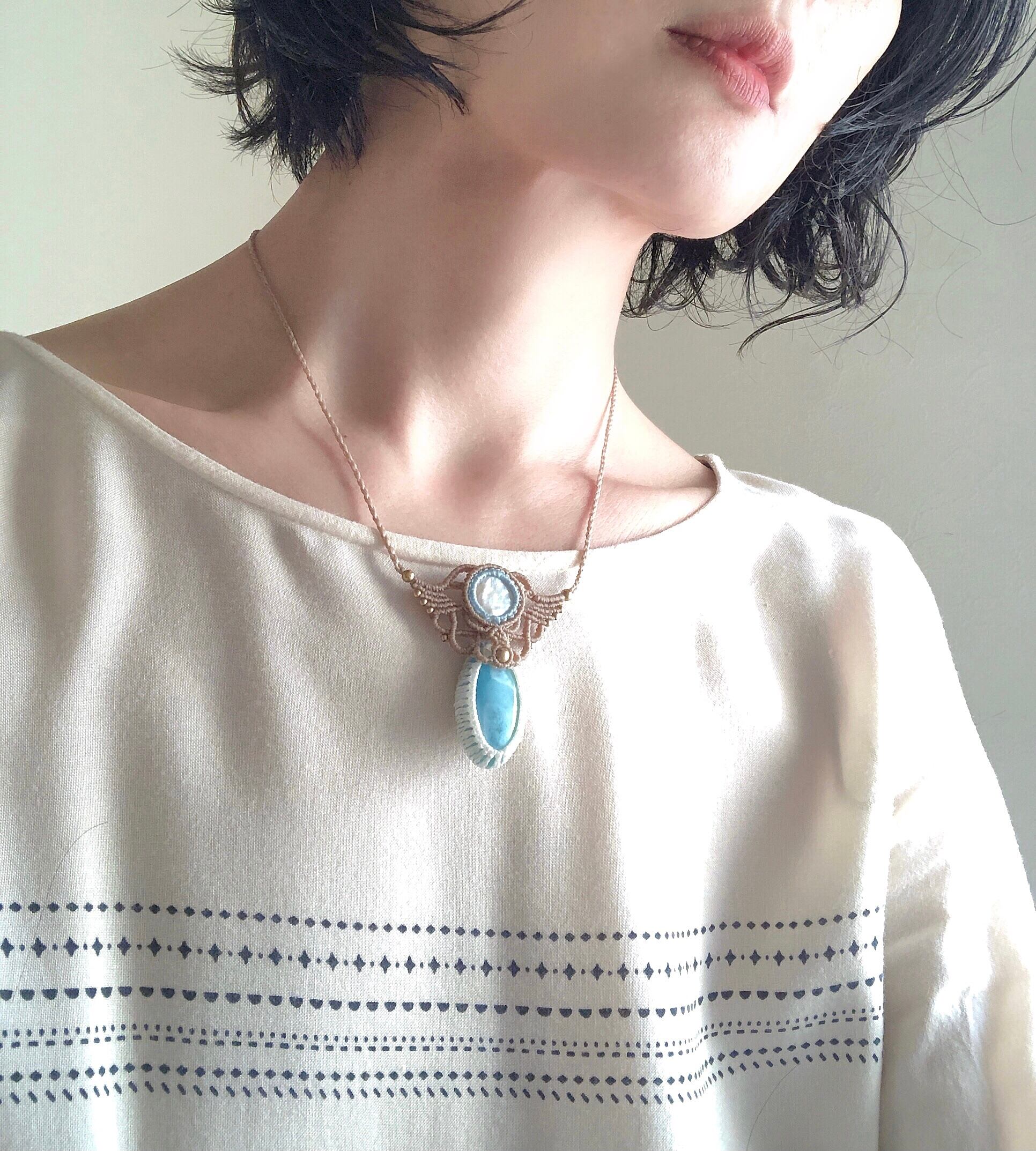 wing*優しいお守り♪ラリマーとパールの天然石マクラメネックレス Larimar Necklace