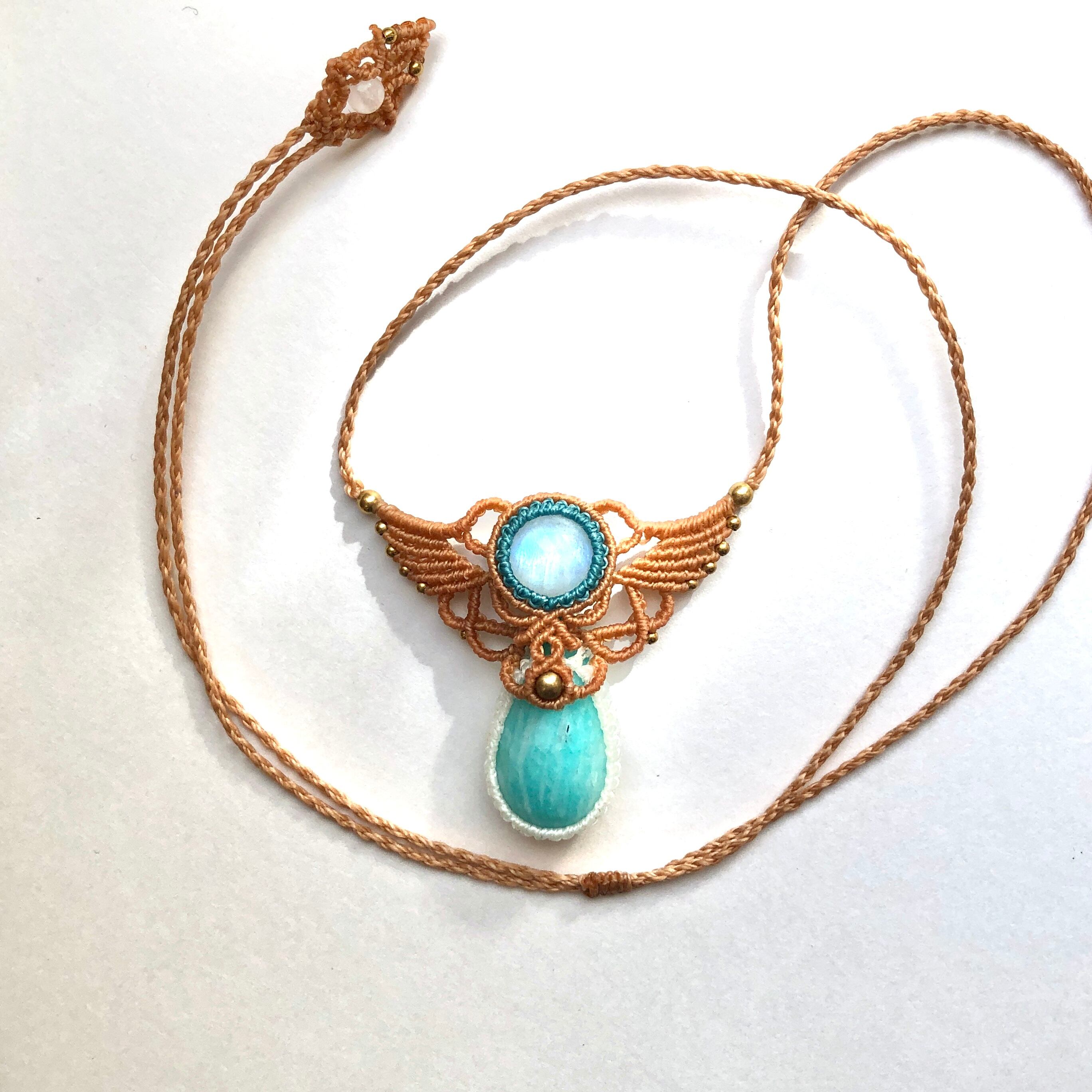 wing*希望のお守りジュエリー。アマゾナイトとレインボームーンストーン♪天然石マクラメネックレス Larimar Necklace