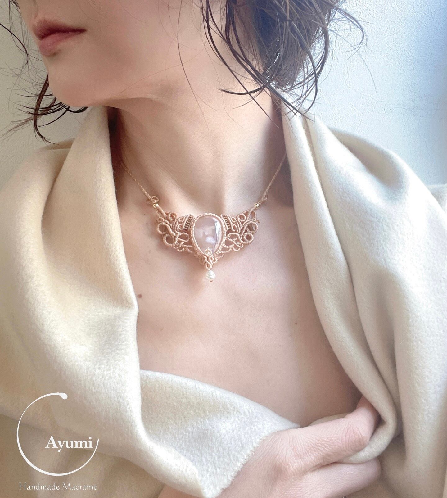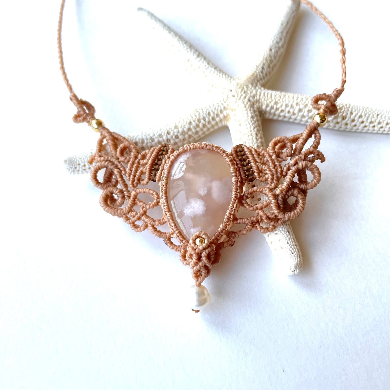 花咲かせましょ*桜アゲートとパール♪天然石マクラメネックレス Sakura Agate Necklace