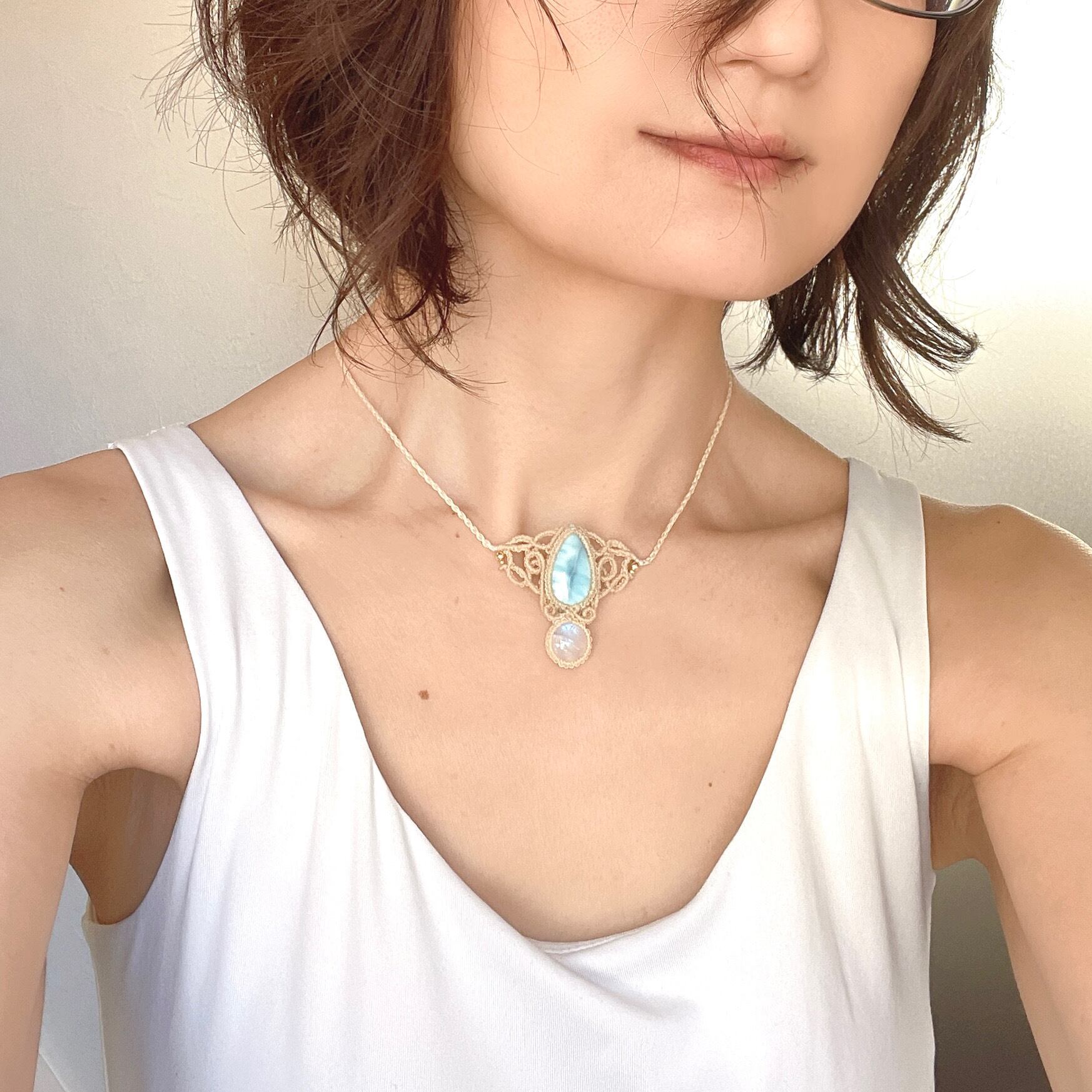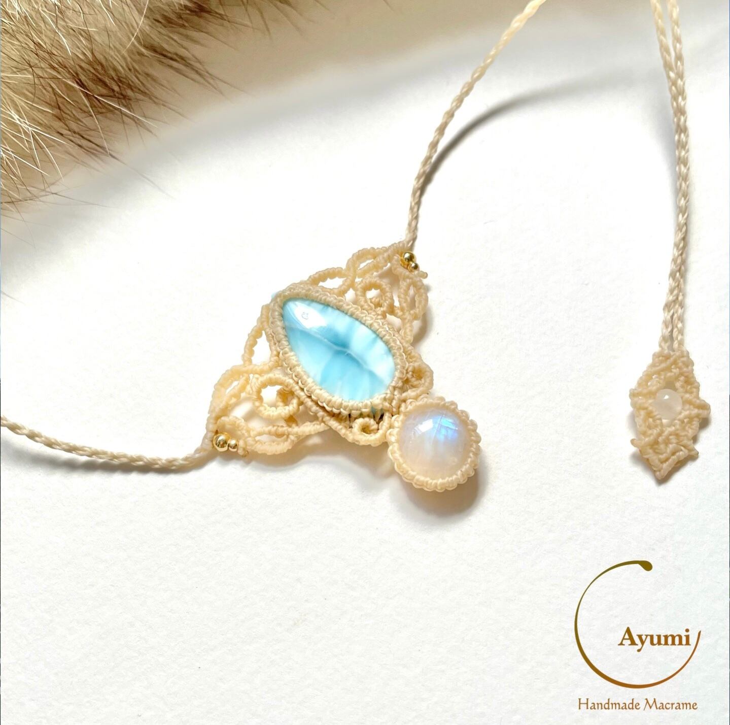 優しいお守り*ラリマーとレインボームーンストーンの天然石マクラメネックレス Larimar Necklace