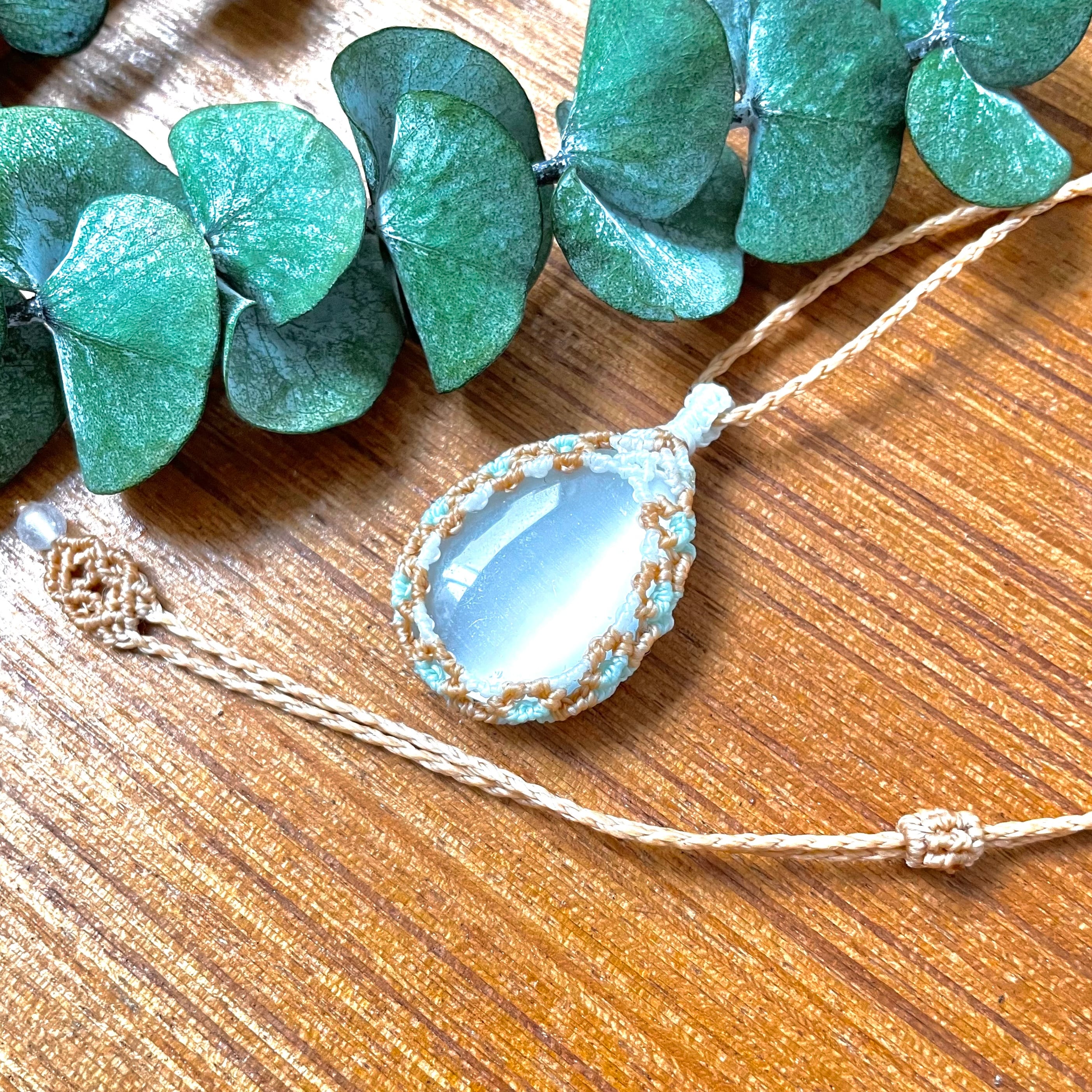 謎のホワイトキャッツアイ♪セレナイト風マクラメネックレス Cat's Eye Necklace