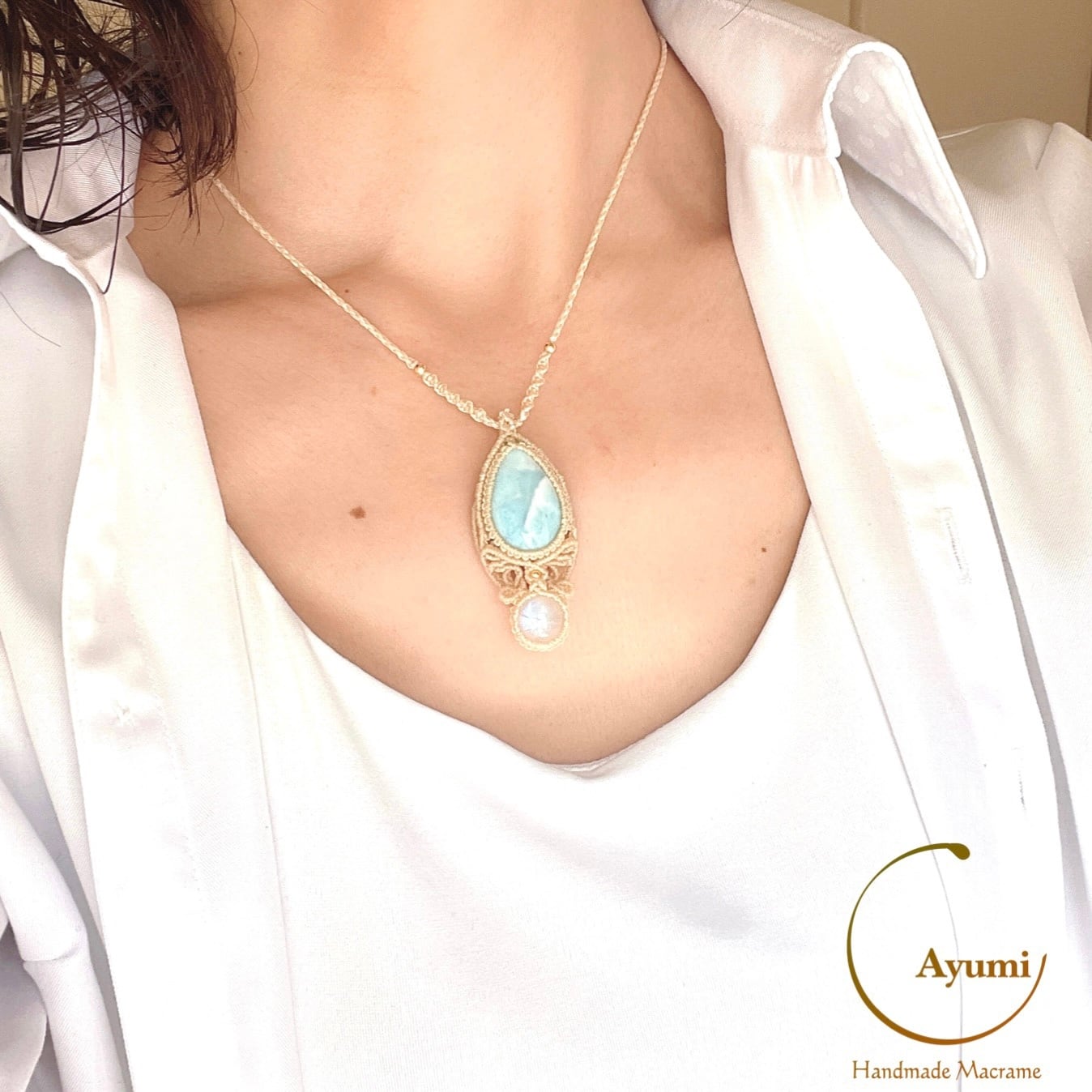 優しいお守り♪ラリマーとレインボームーンストーンの天然石アクセサリー・マクラメネックレスsizuku Larimar Necklace