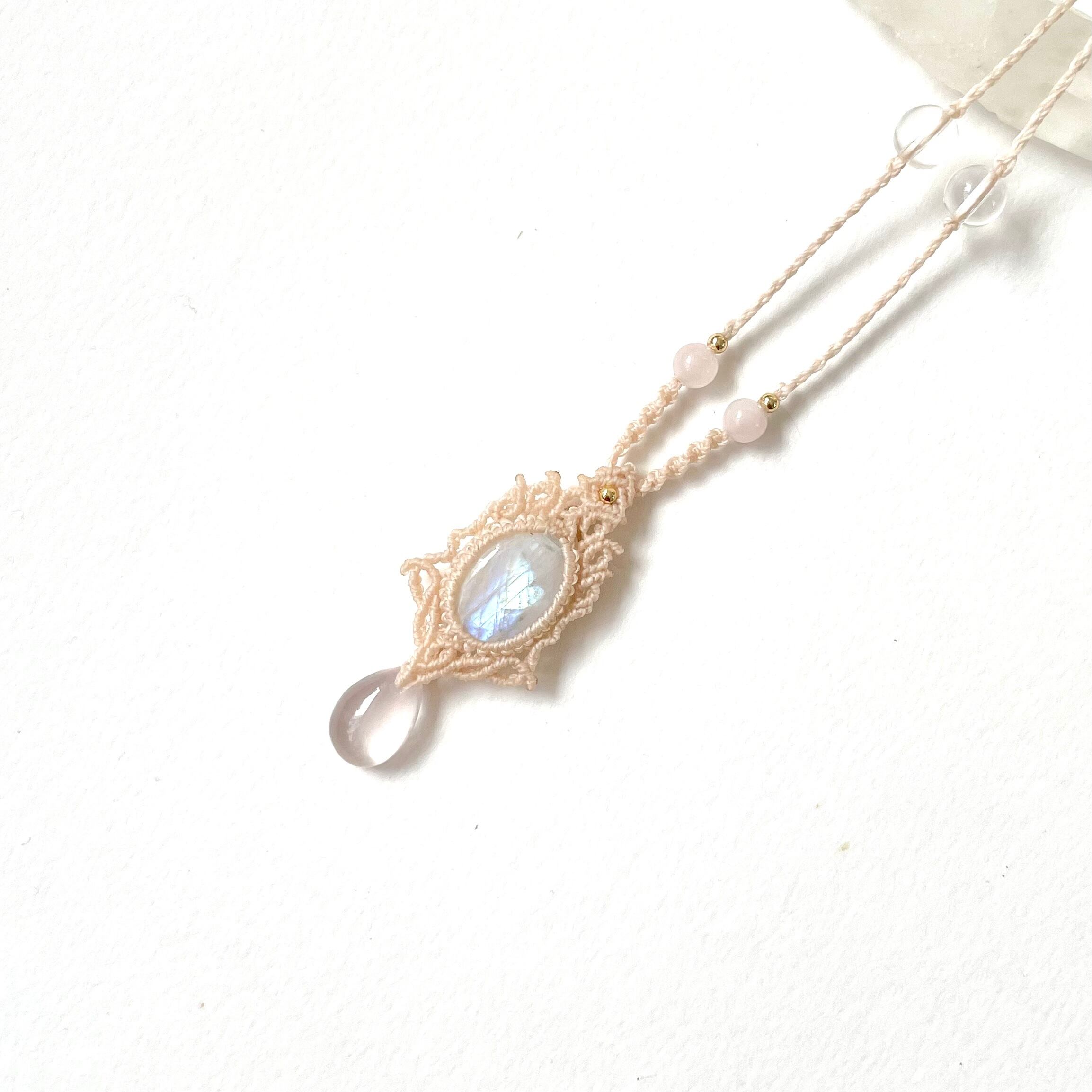 乙女なレインボームーンストーンとスターローズの天然石アクセサリー・マクラメネックレス♪