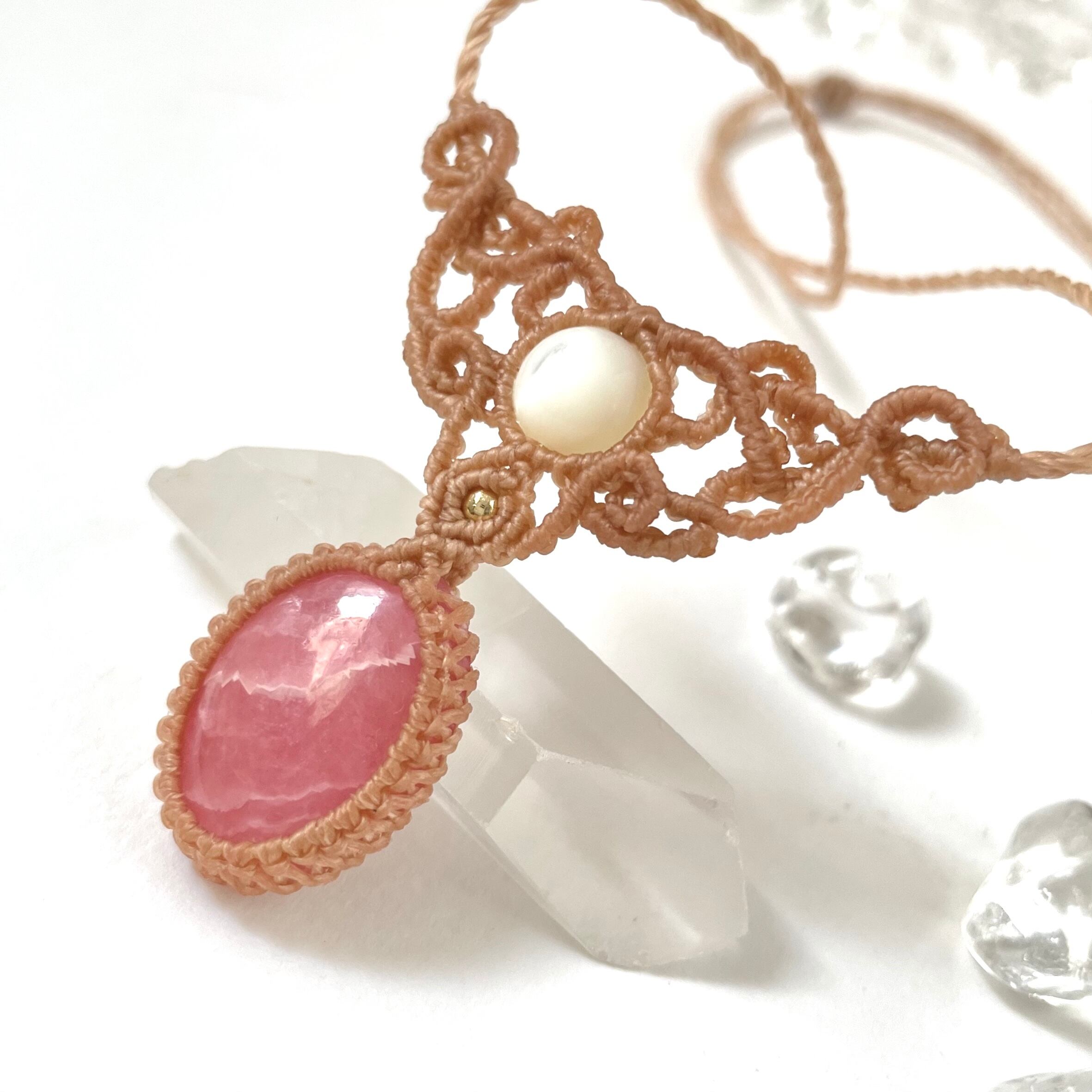 kuru*インカローズとマザーオブパールの天然石マクラメネックレス