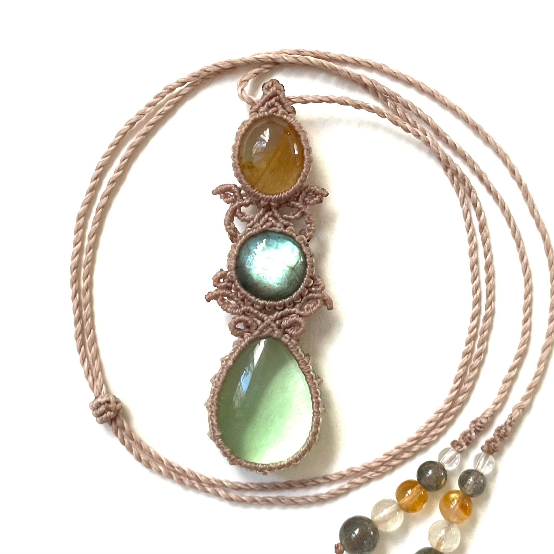 ルチルクォーツ・ラブラドライトとフローライトの天然石マクラメネックレス