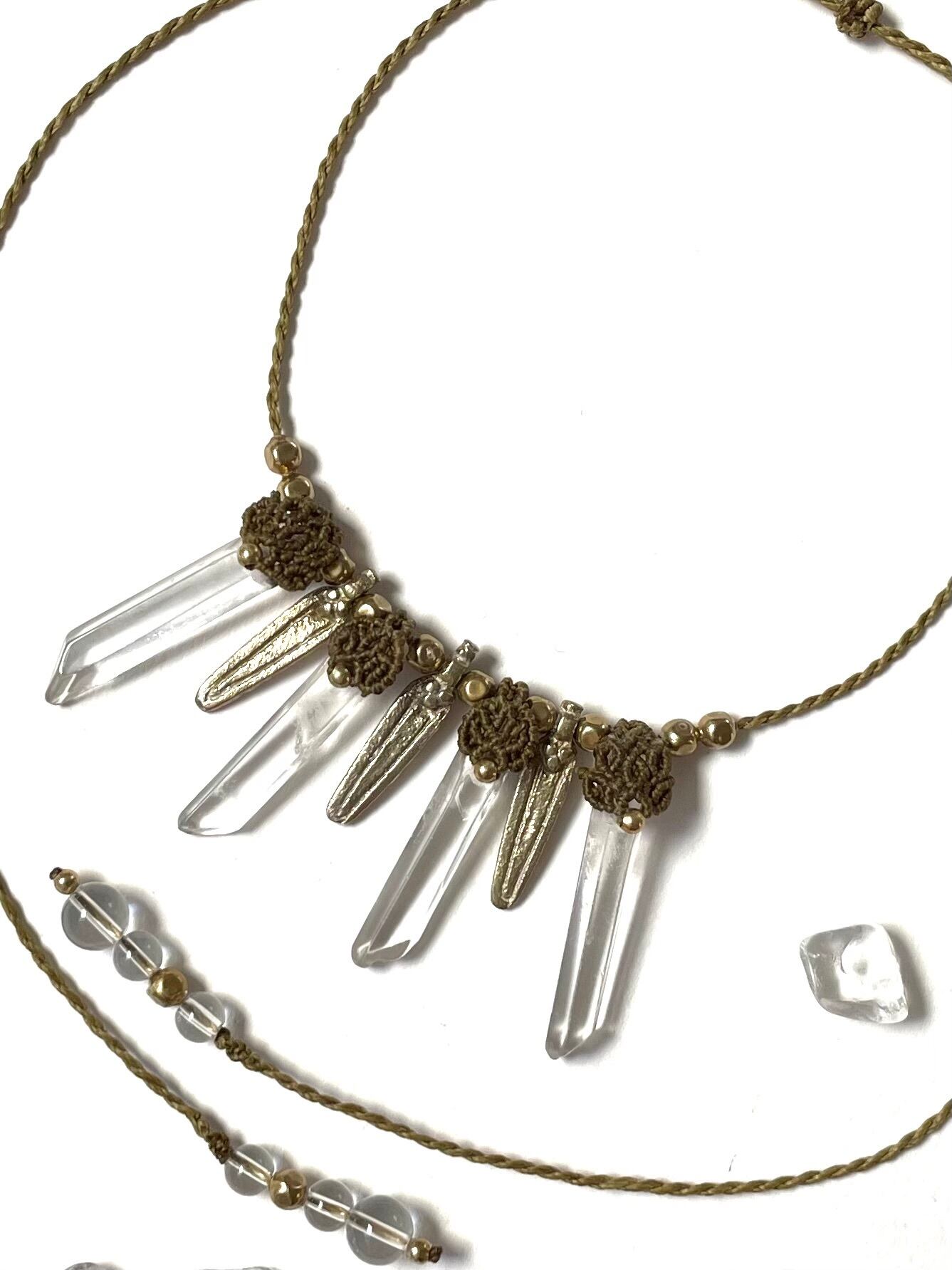 水晶ポイントとブラスチャームの天然石マクラメ編みネックレス